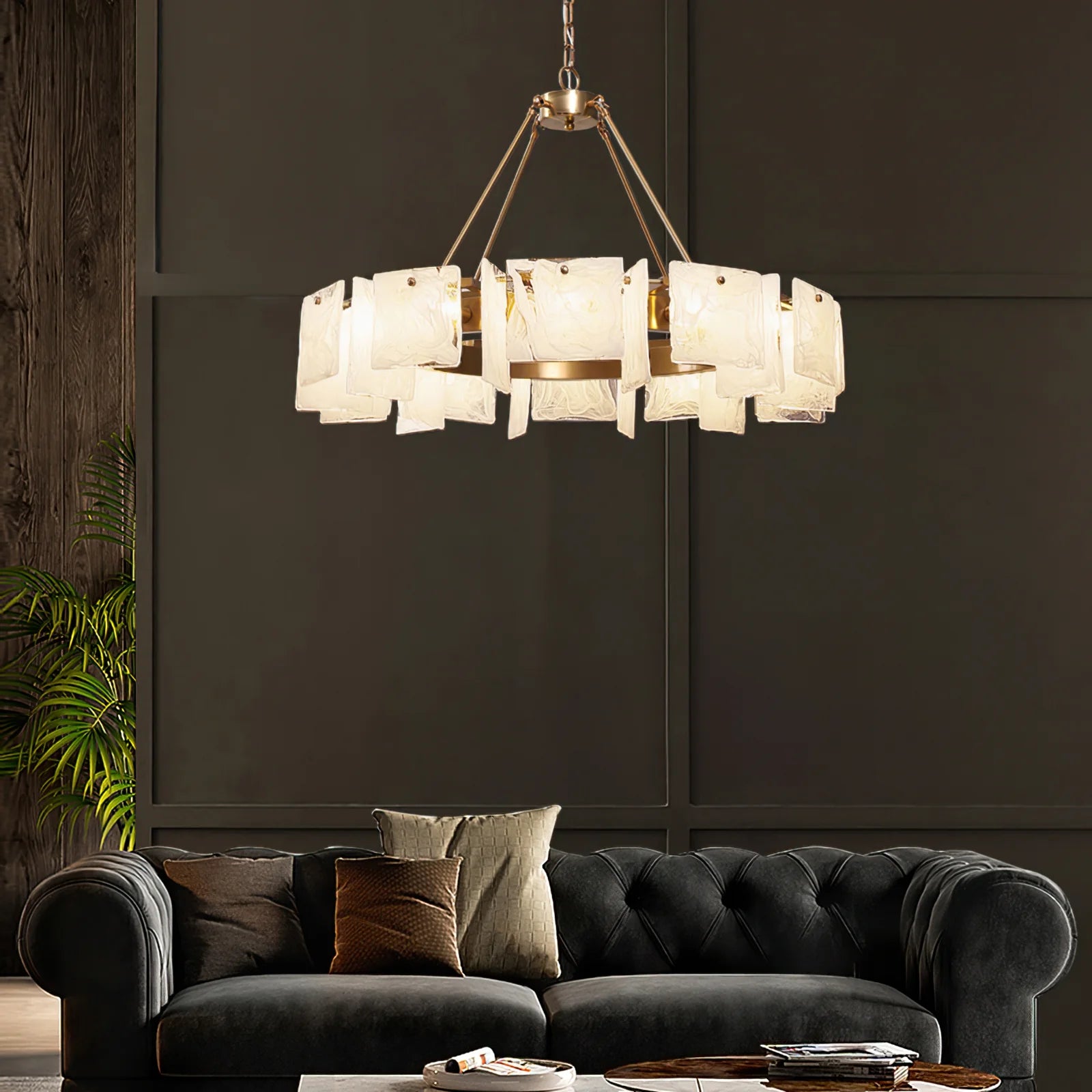 The Alsona Chandelier from Katianlight is a luxurious lighting fixture crafted from stainless steel and glass with a beautiful copper hue. This chandelier features elegantly arranged glass panels that diffuse light softly, creating a warm and inviting atmosphere. Its robust stainless steel structure ensures durability, while the copper finish adds a touch of sophistication. Perfect for any modern or classic interior, the Alsona Chandelier from dekorfine is designed to be the focal point of your living space.