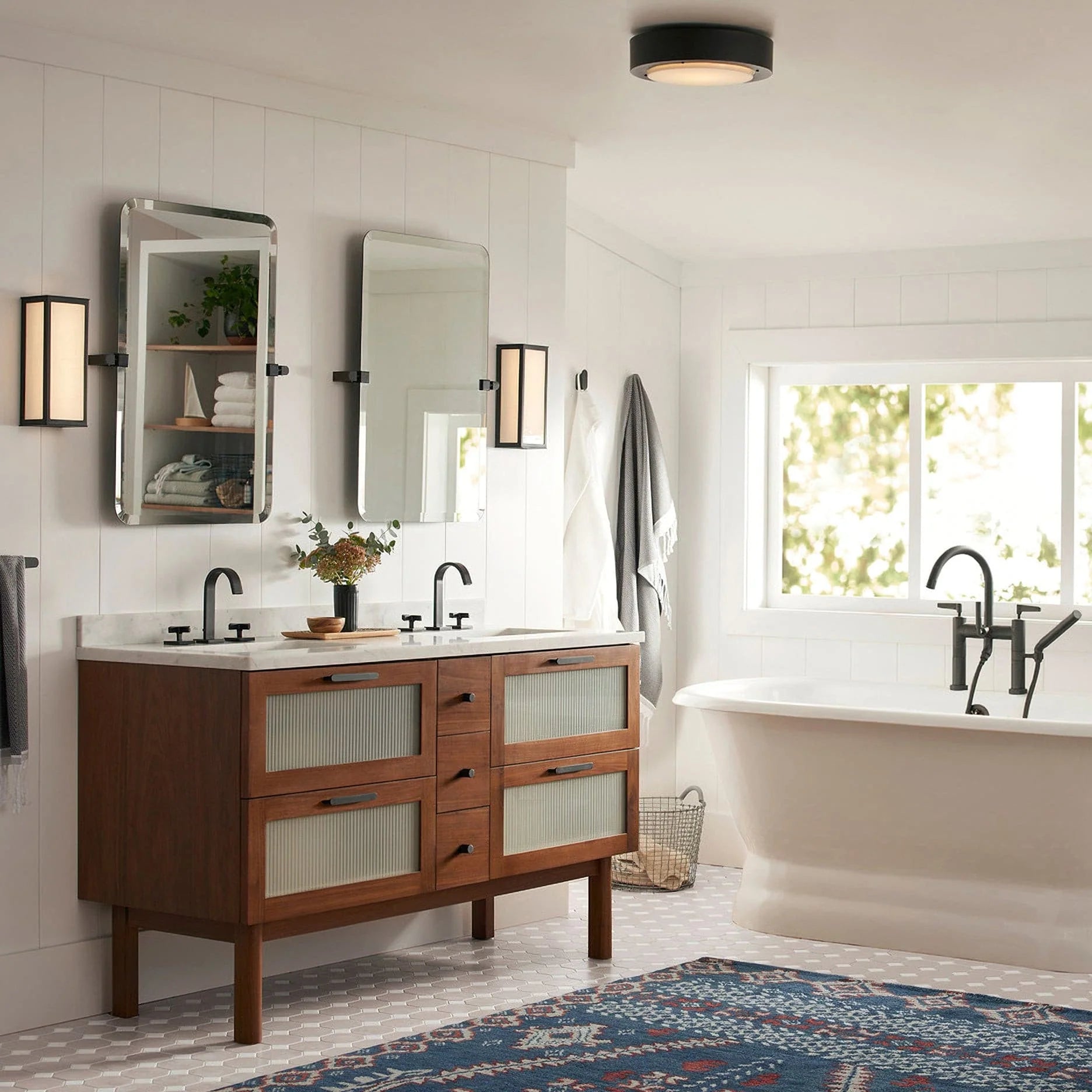 Bathroom wall lighting is often mounted above and/or alongside the mirrored medicine cabinet or bathroom mirror. This placement provides ample bright light for many bathroom tasks, including grooming and applying lotions and makeup.