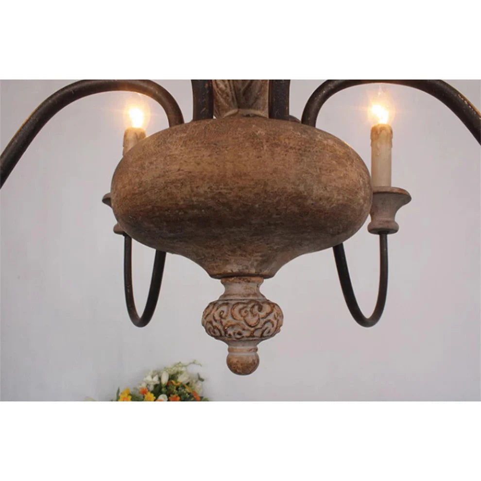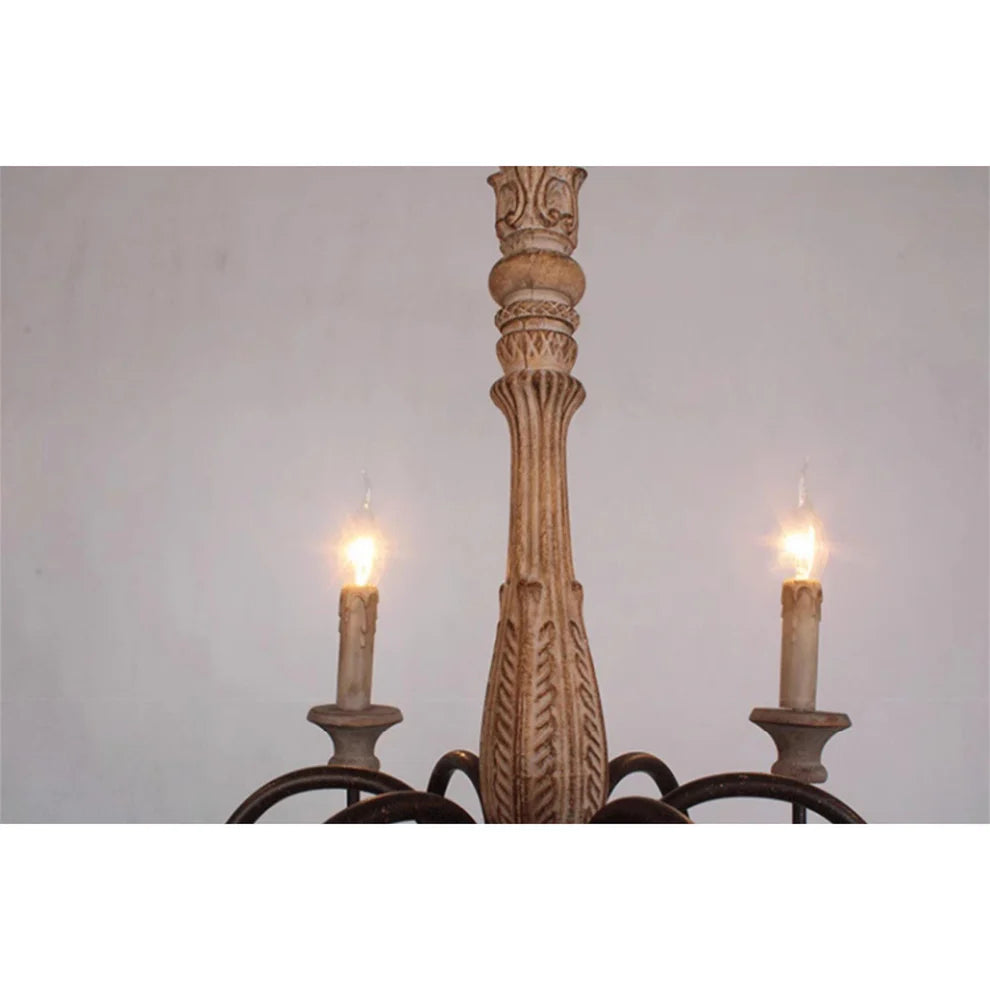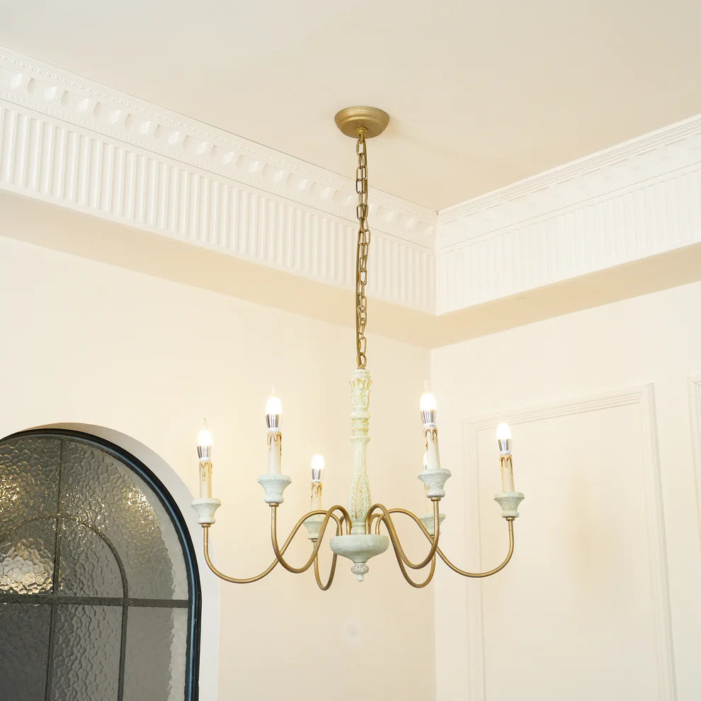 This 6-Lighr french county rustic farmhouse chandelier makes an unexpected addition to any home! Six elegantly curved arms with vintage white accents, from the middle solid wood column to upward facing candle sticks, which brings a charm of French country style.