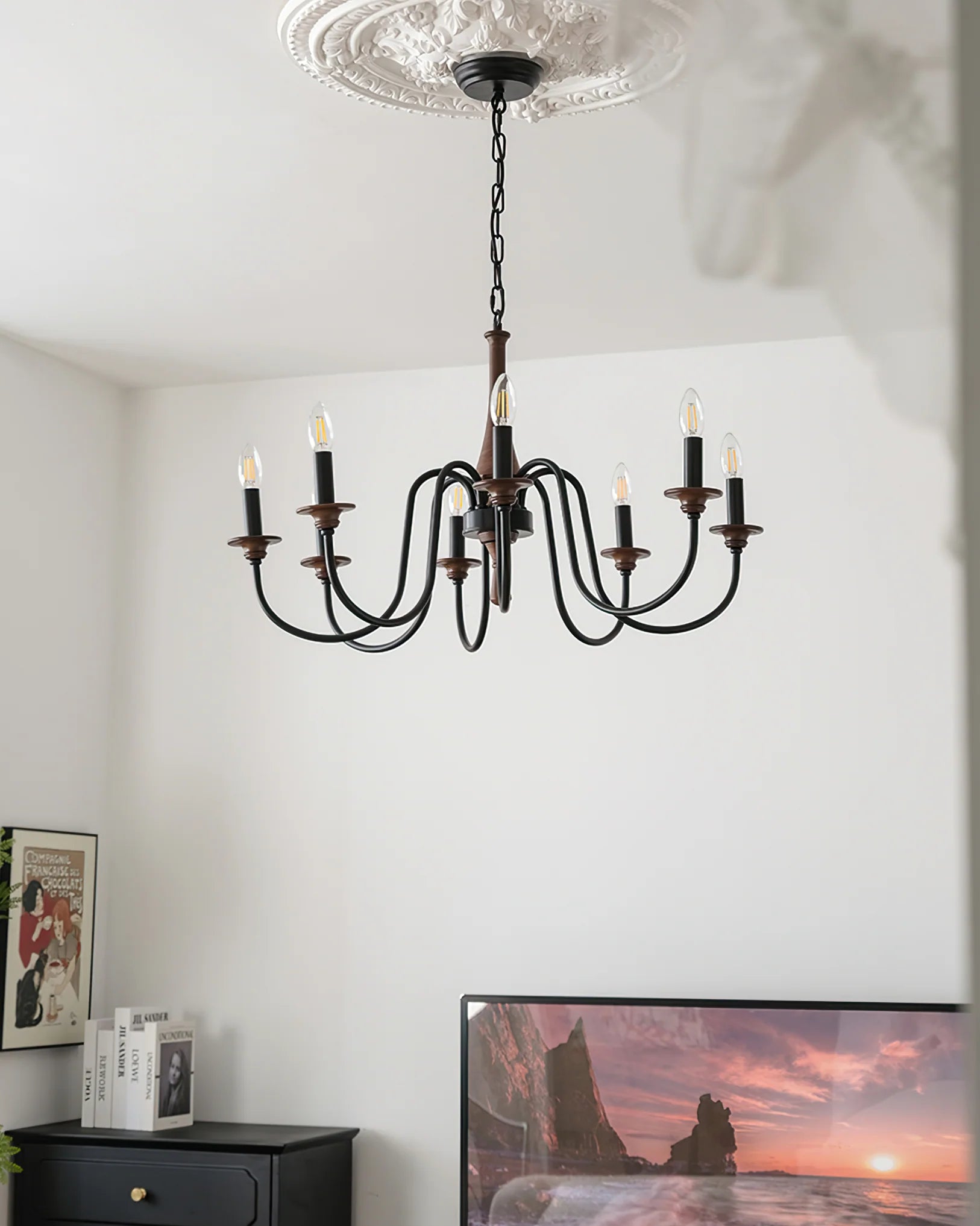 Chandelier is an elegant, decorative light fixture that is both functional and beautiful, often serving as a focal point for a room.