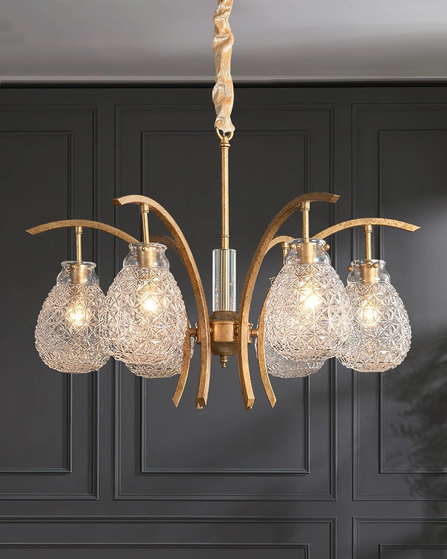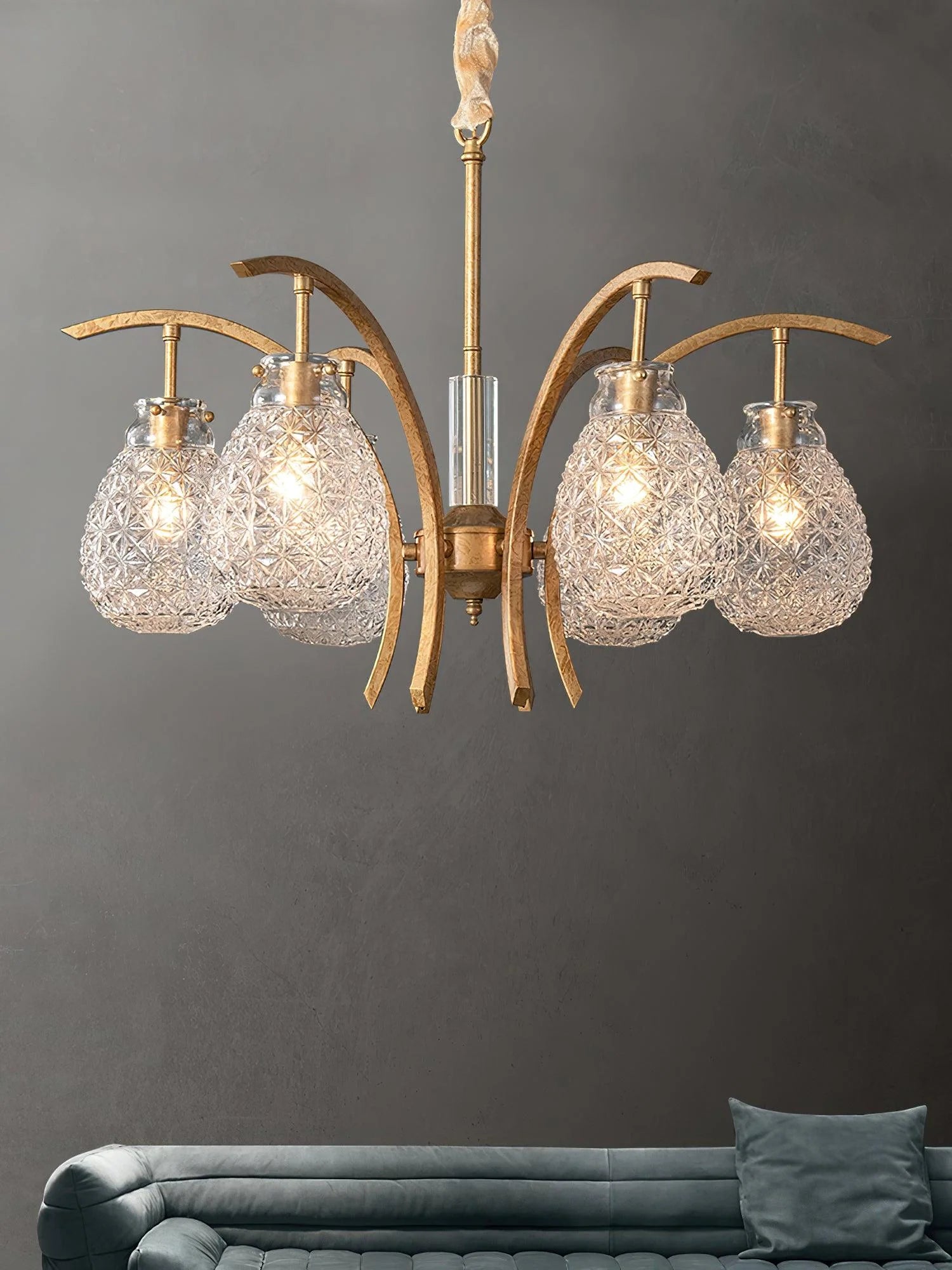 It shows the combination of exquisite golden arc structure and sculptural lampshade. Its vintage design details and elegant lines bring a luxurious revival feel to the space. This chandelier is designed to add a classic and elegant feel to indoor environments through its even light and layered appearance.