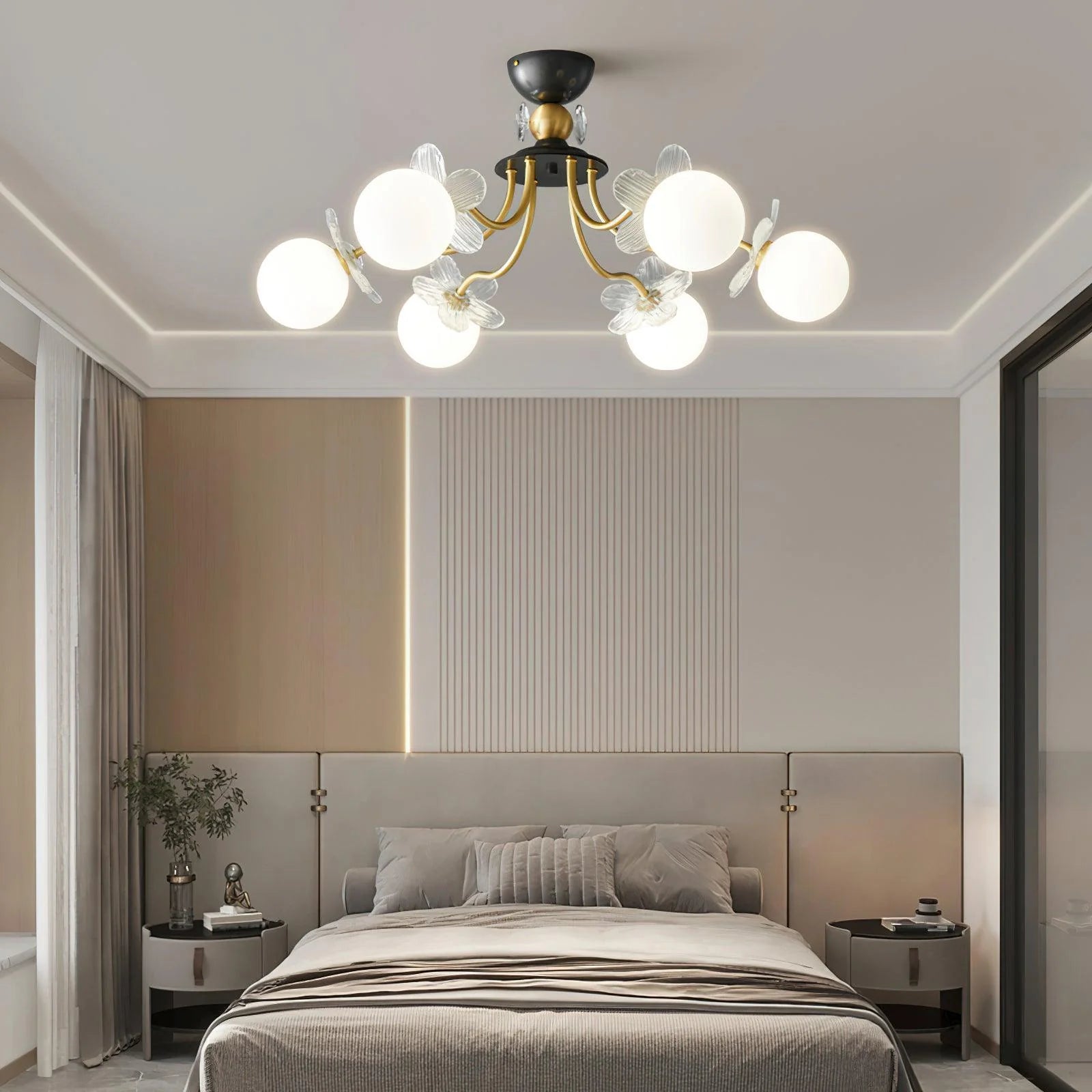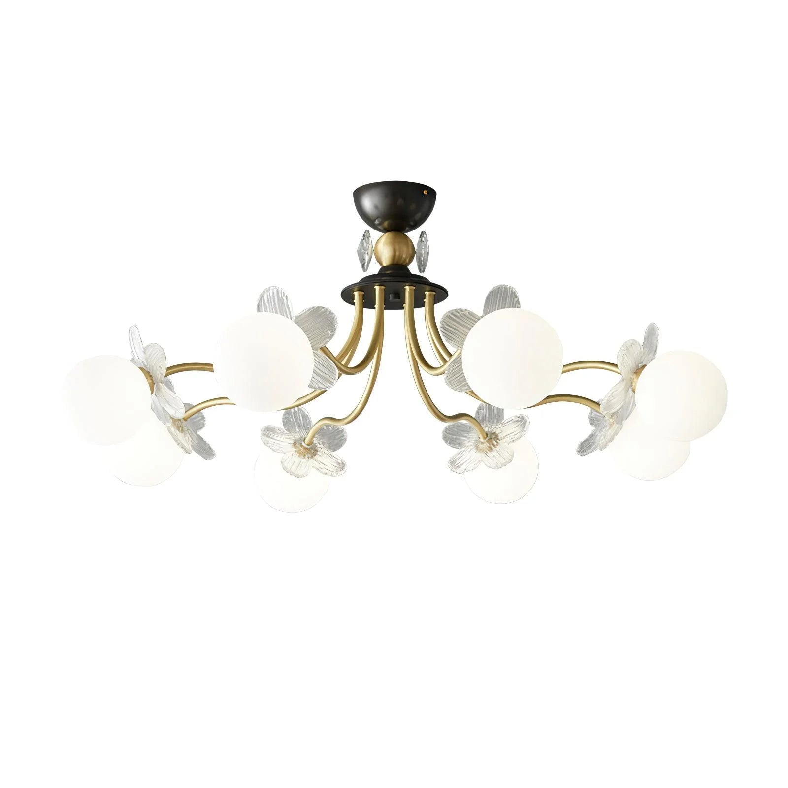 Blossom Glow is inspired by the natural elegance of blooming flowers. Featuring white glass globes set between delicate glass petals and gilded branches, this chandelier adds a touch of botanical beauty to any space.
