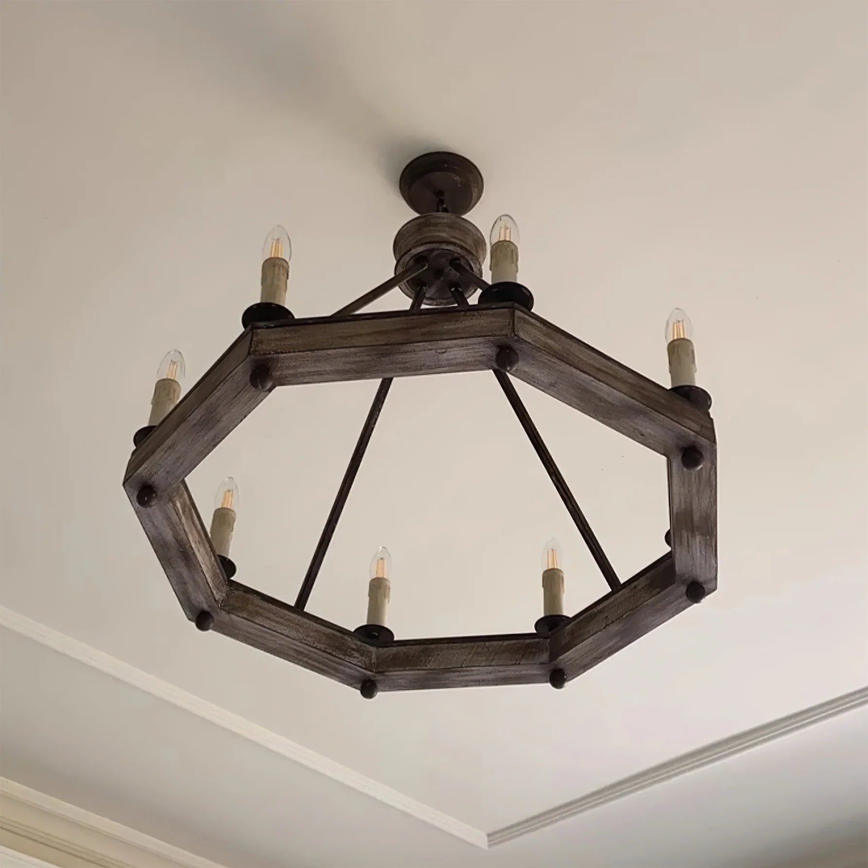 The Bonfire Chandelier is a striking blend of metal and wood, designed to evoke the rustic charm of a bonfire. Its circular wooden frame is supported by sturdy black metal arms that extend upwards in a geometric pyramid shape, reminiscent of the kindling structure of a traditional fire pit. Eight candle-style bulbs sit atop the wooden ring, each held in place by sleek metal accents, creating a warm, inviting glow that fills the space. With its combination of organic wood tones and industrial metal finishes, this chandelier brings a cozy yet sophisticated ambiance to any room, perfect for adding a touch of farmhouse or rustic elegance.
