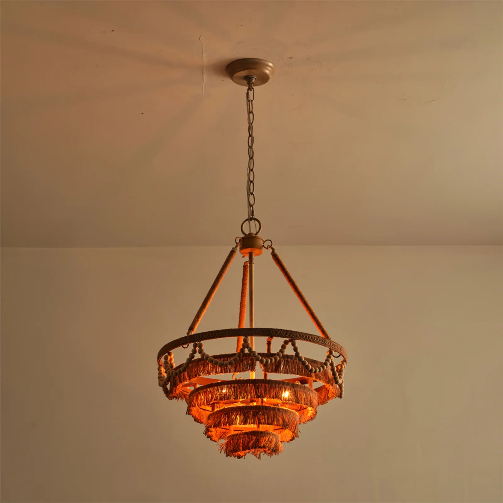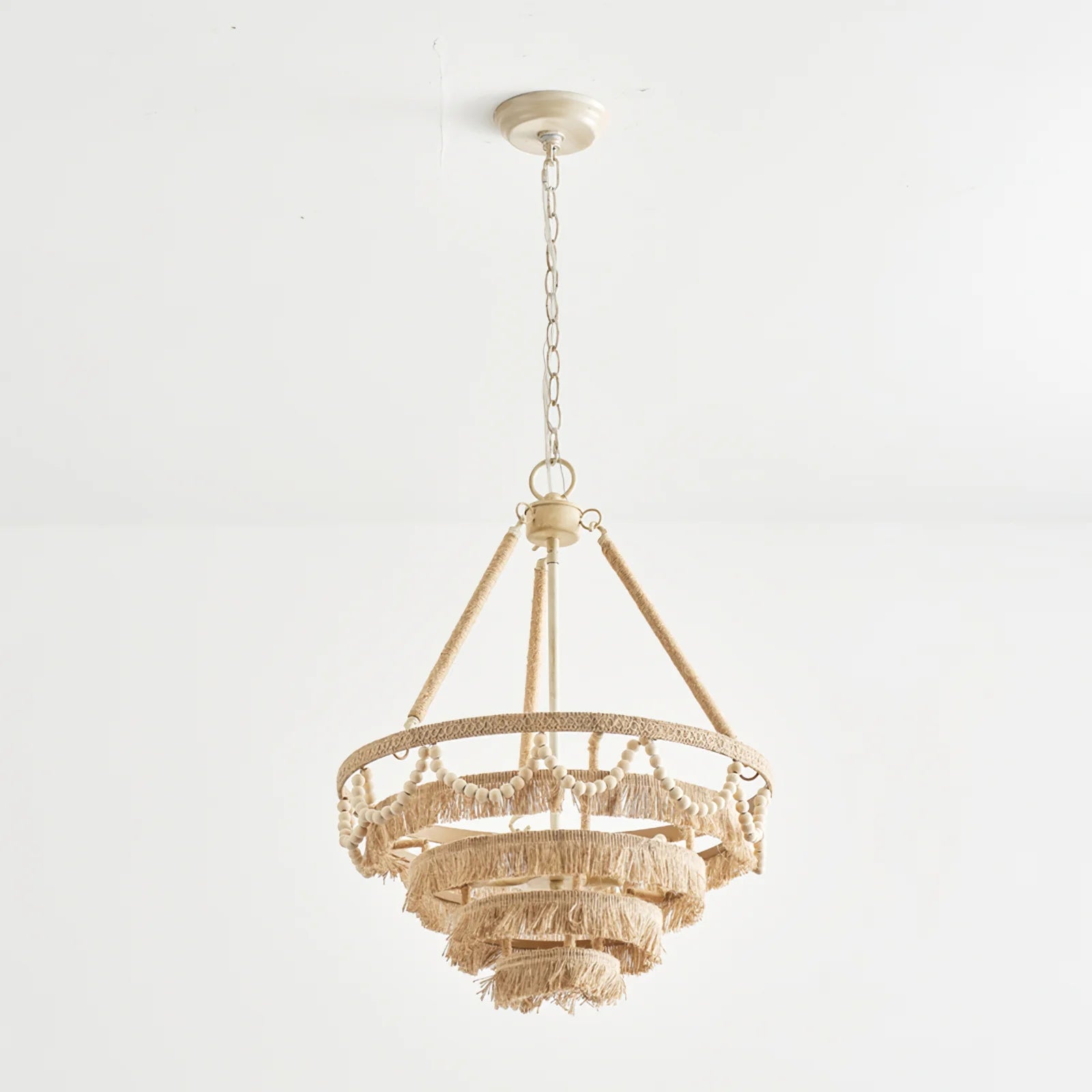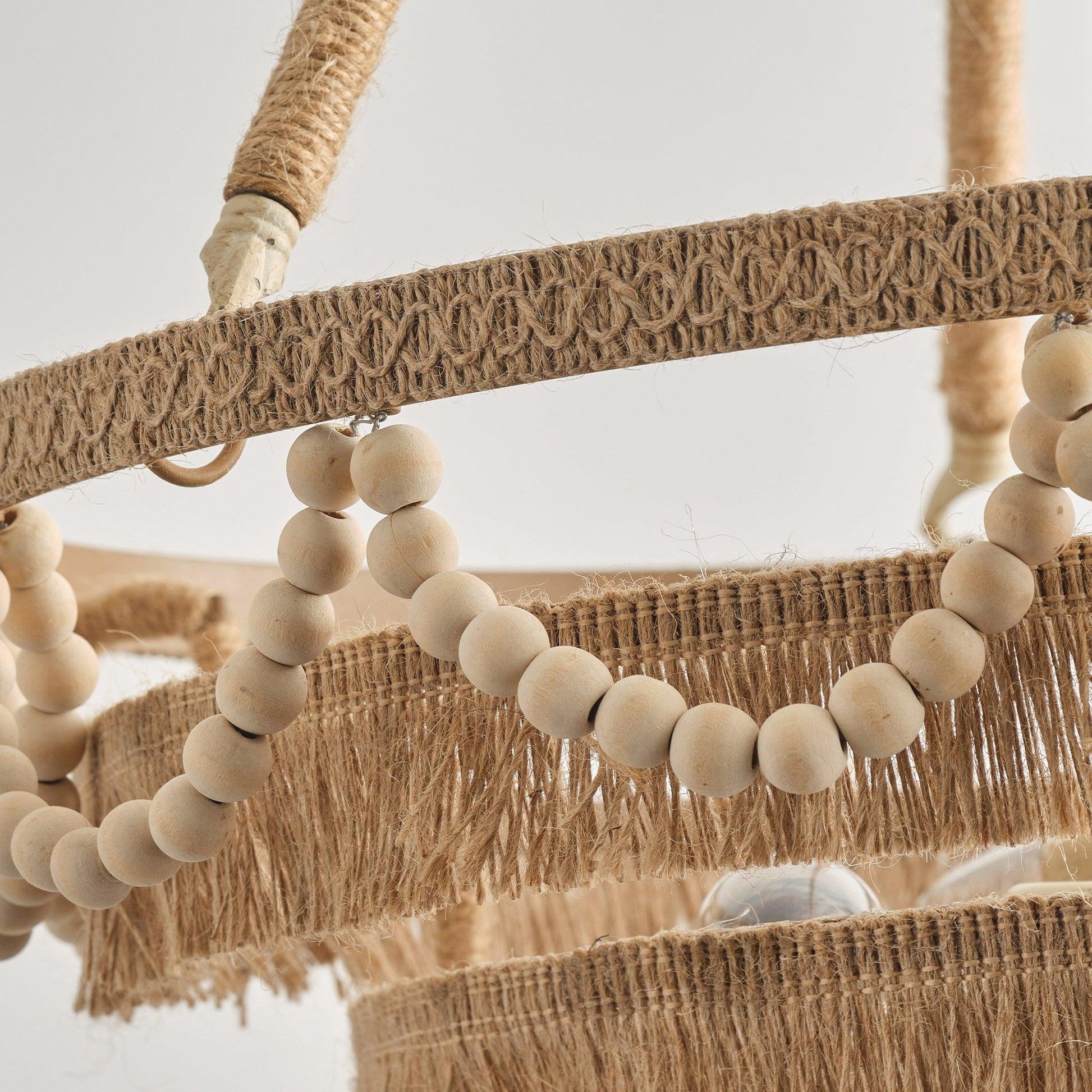 Introducing the Bristol Chandelier from Katianlight, a perfect blend of rustic charm and modern elegance. This chandelier features a circular frame adorned with intricate wooden beads, while layers of soft, natural fringes cascade gracefully, adding texture and warmth to any room. The suspended design, supported by four ropes, enhances its bohemian yet refined style, making it a standout piece in any living space. Ideal for creating a cozy yet sophisticated ambiance, the Bristol Chandelier is a must-have for those looking to elevate their interior design with an artisanal touch.