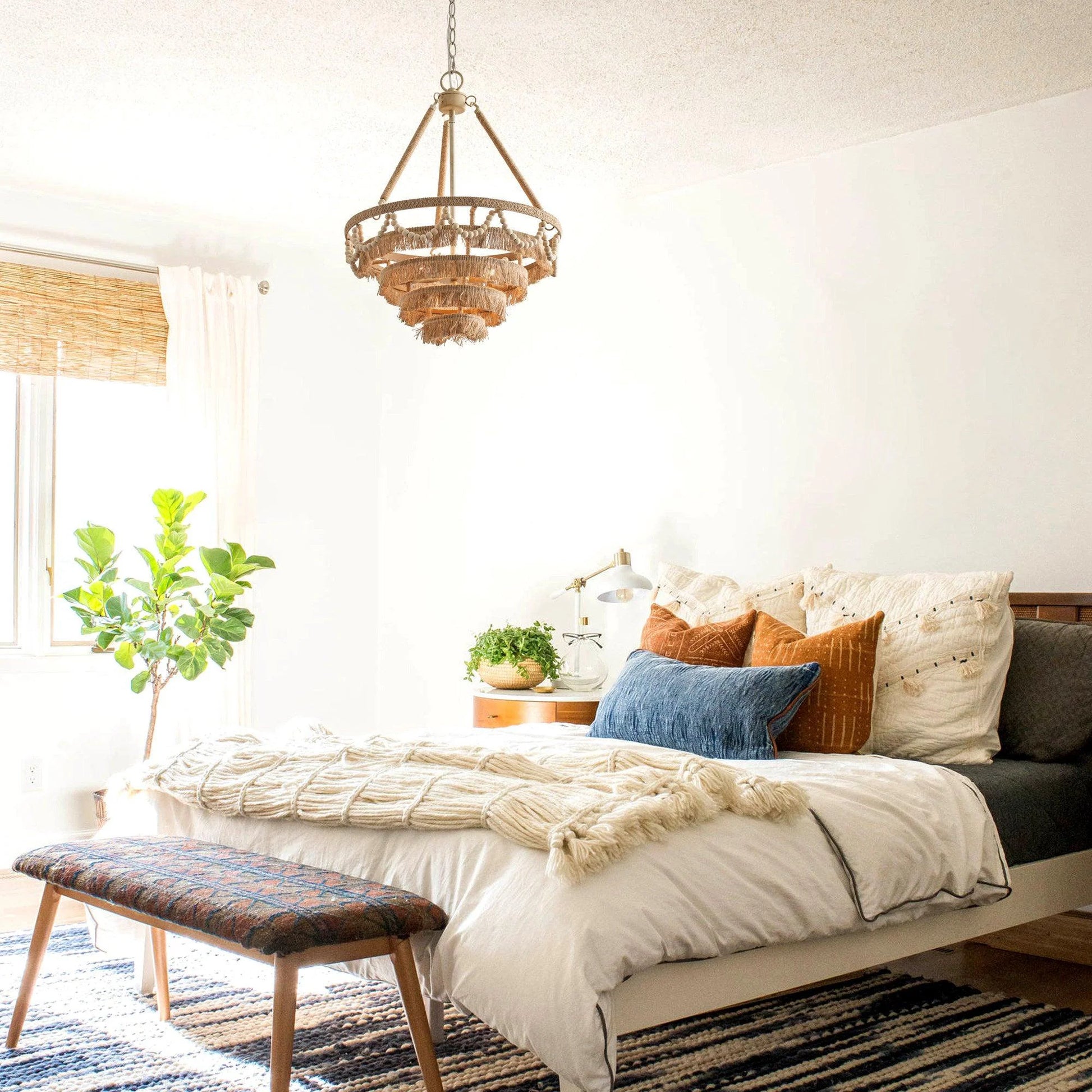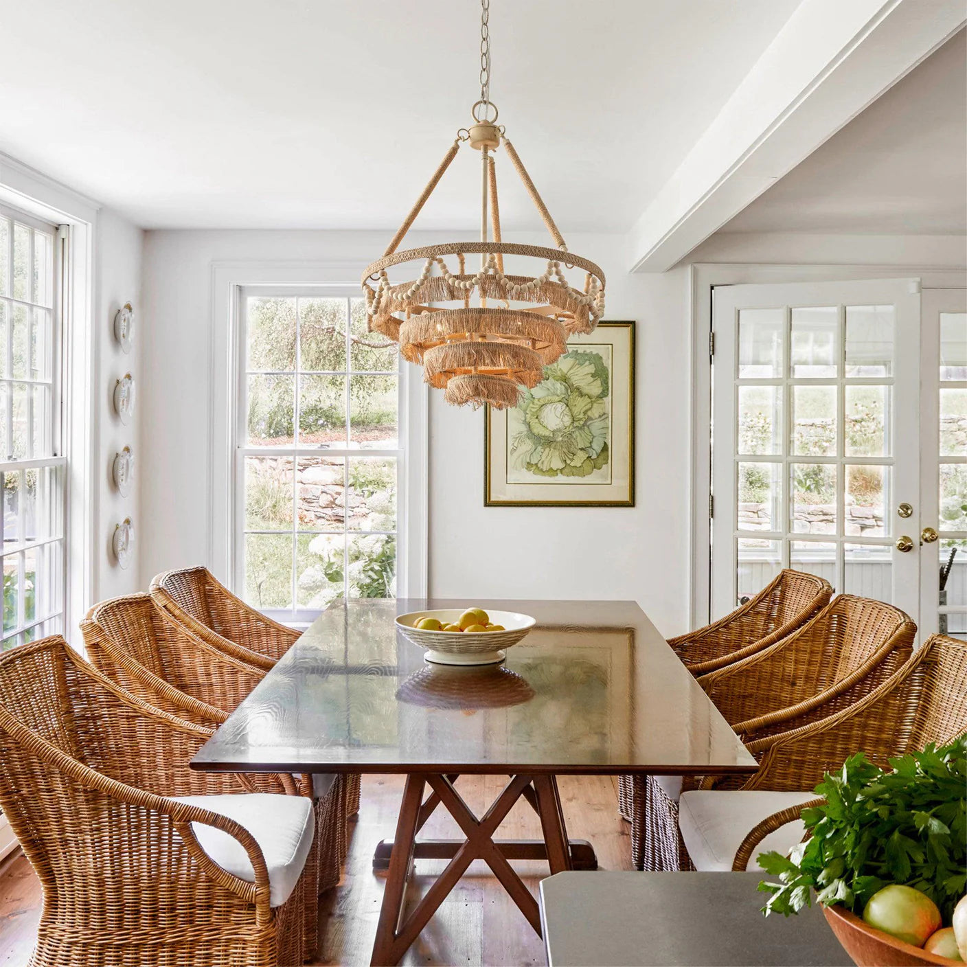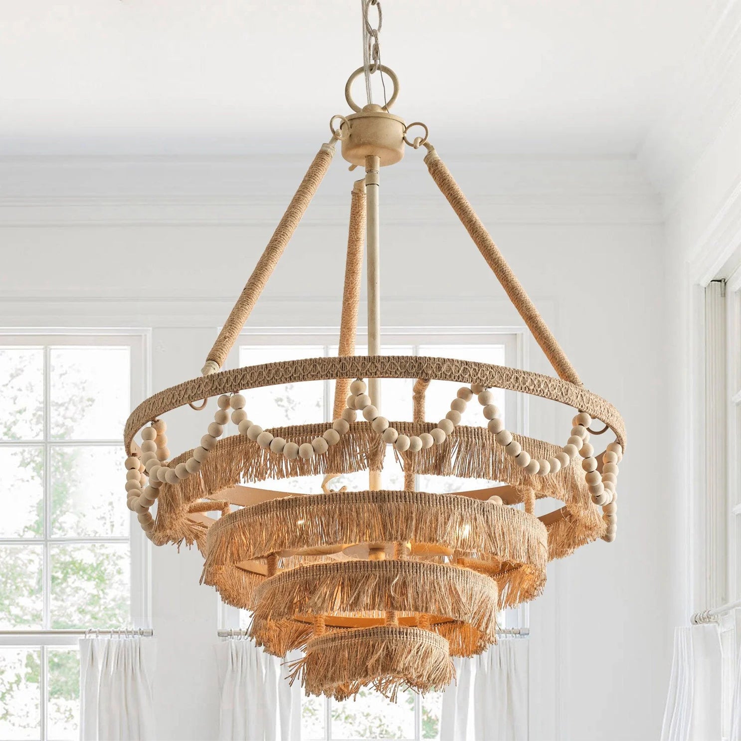 Introducing the Bristol Chandelier from Katianlight, a perfect blend of rustic charm and modern elegance. This chandelier features a circular frame adorned with intricate wooden beads, while layers of soft, natural fringes cascade gracefully, adding texture and warmth to any room. The suspended design, supported by four ropes, enhances its bohemian yet refined style, making it a standout piece in any living space. Ideal for creating a cozy yet sophisticated ambiance, the Bristol Chandelier is a must-have for those looking to elevate their interior design with an artisanal touch.