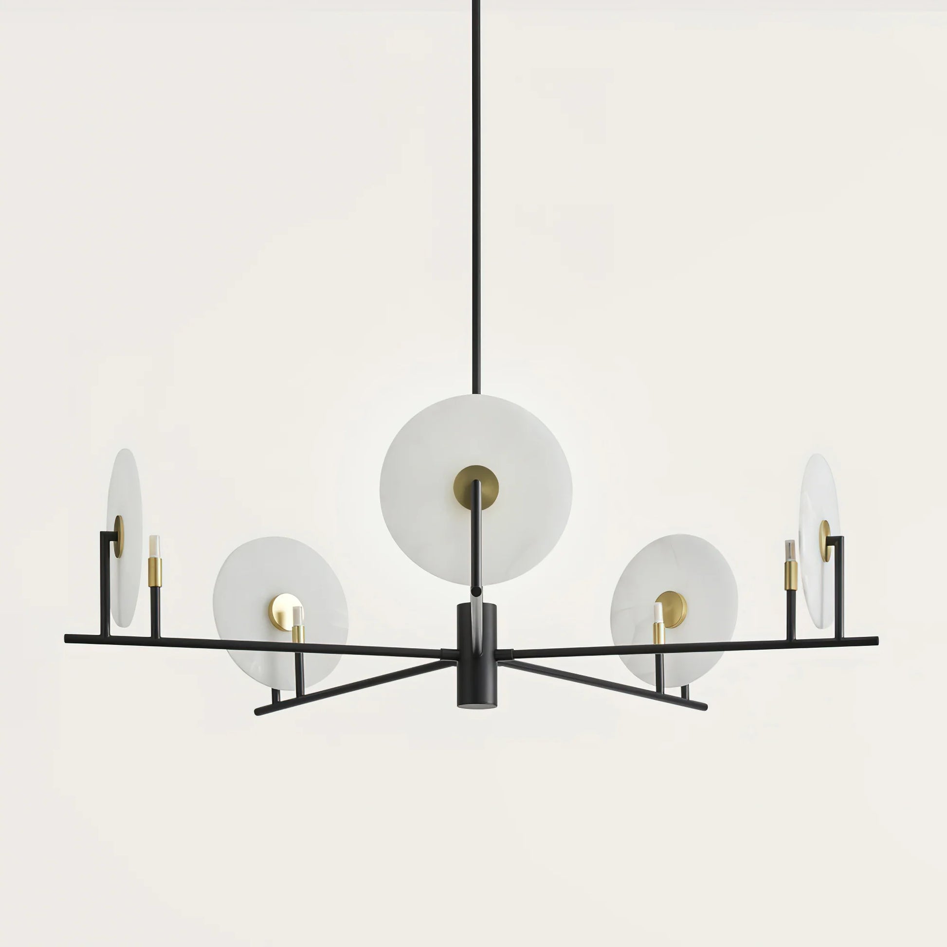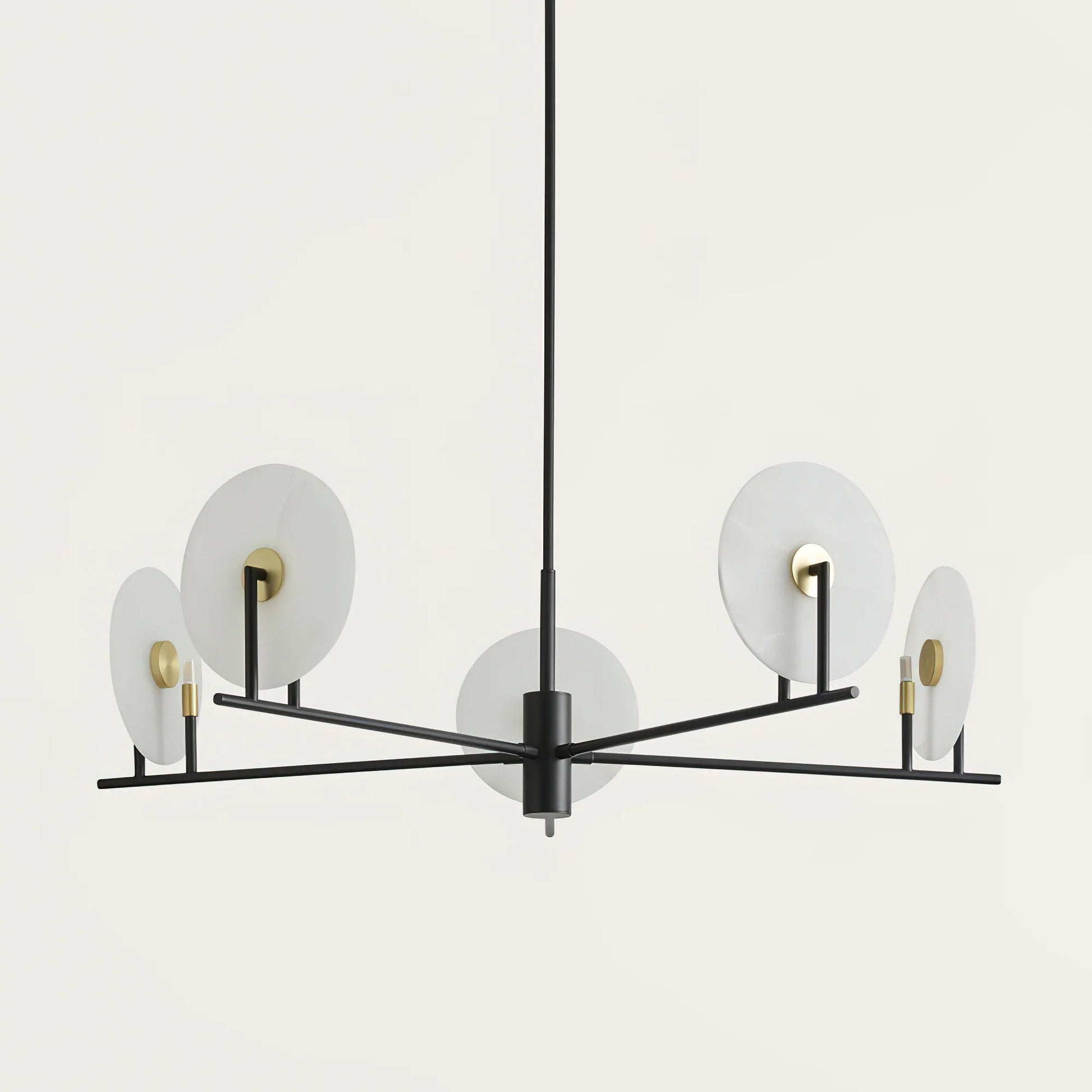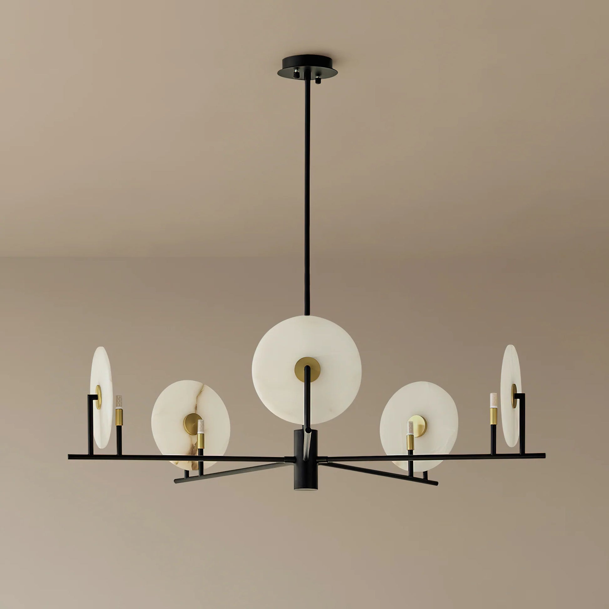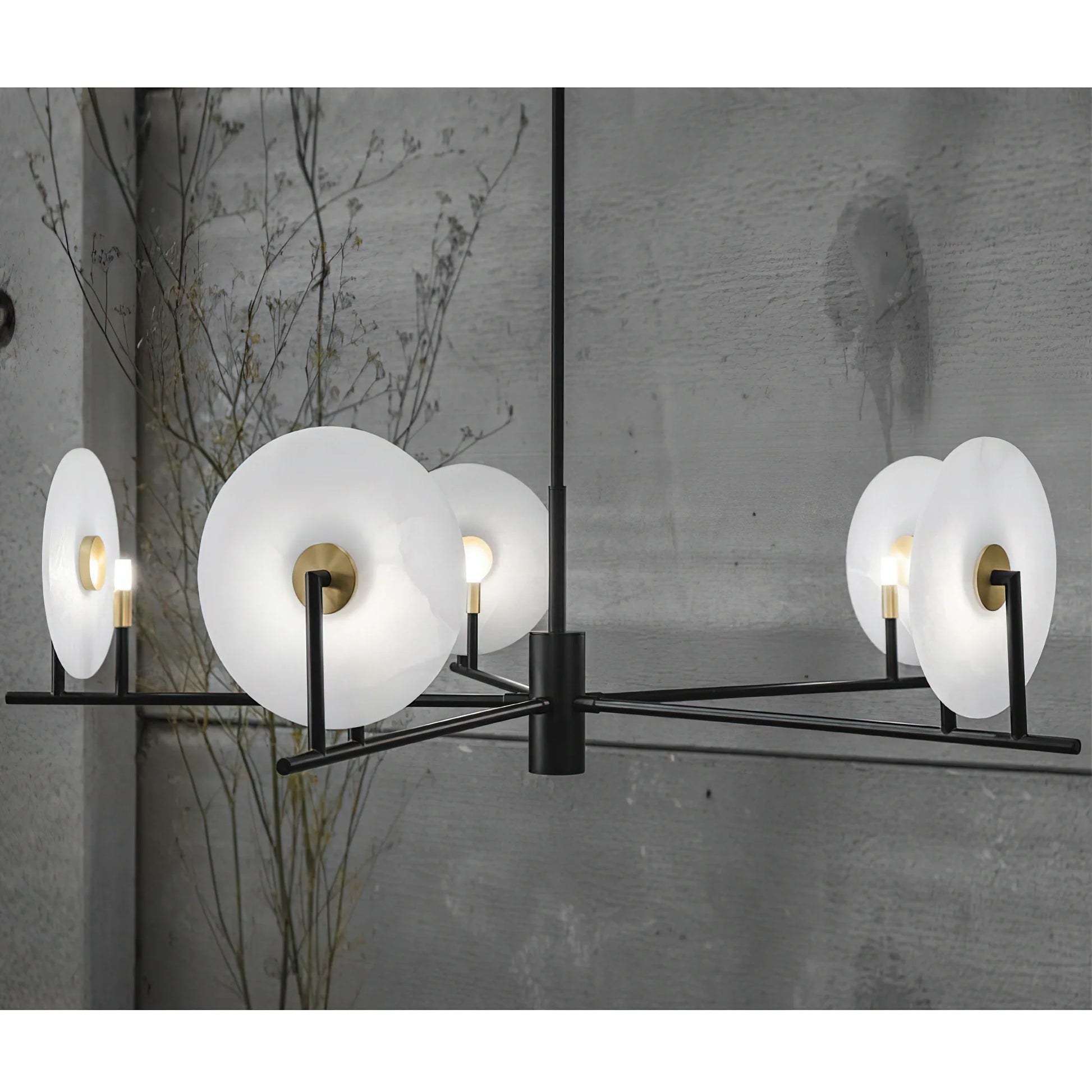 The Callisto Alabaster Chandelier by katianlight brings celestial elegance to contemporary interiors. Featuring radiant alabaster discs that resemble glowing moons, each shade is suspended on a bold black frame accented with warm brass details. The natural veining of the alabaster adds organic texture, while the minimalist lines and symmetrical composition lend a modern, sculptural presence.