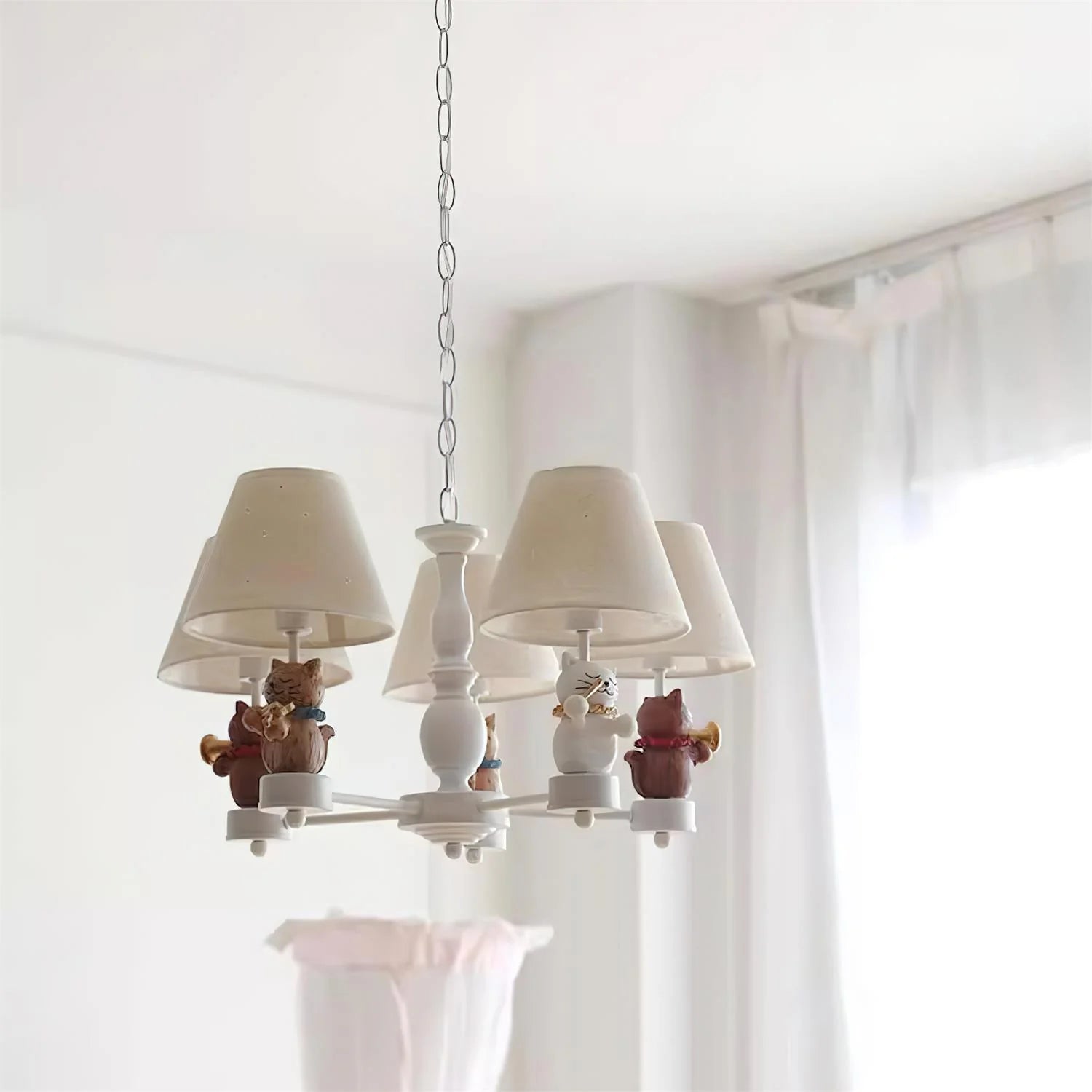 The Cat Symphony Chandelier brings a whimsical harmony to any room with its delightful ensemble of feline musicians. Each cat figurine, crafted with charming detail, appears mid-performance—strumming, blowing, or conducting with joy—creating a playful atmosphere that’s perfect for children’s spaces or eclectic interiors. Topped with softly patterned lampshades that glow warmly, this chandelier is available in both white and black bases, offering versatile options to complement a variety of styles.