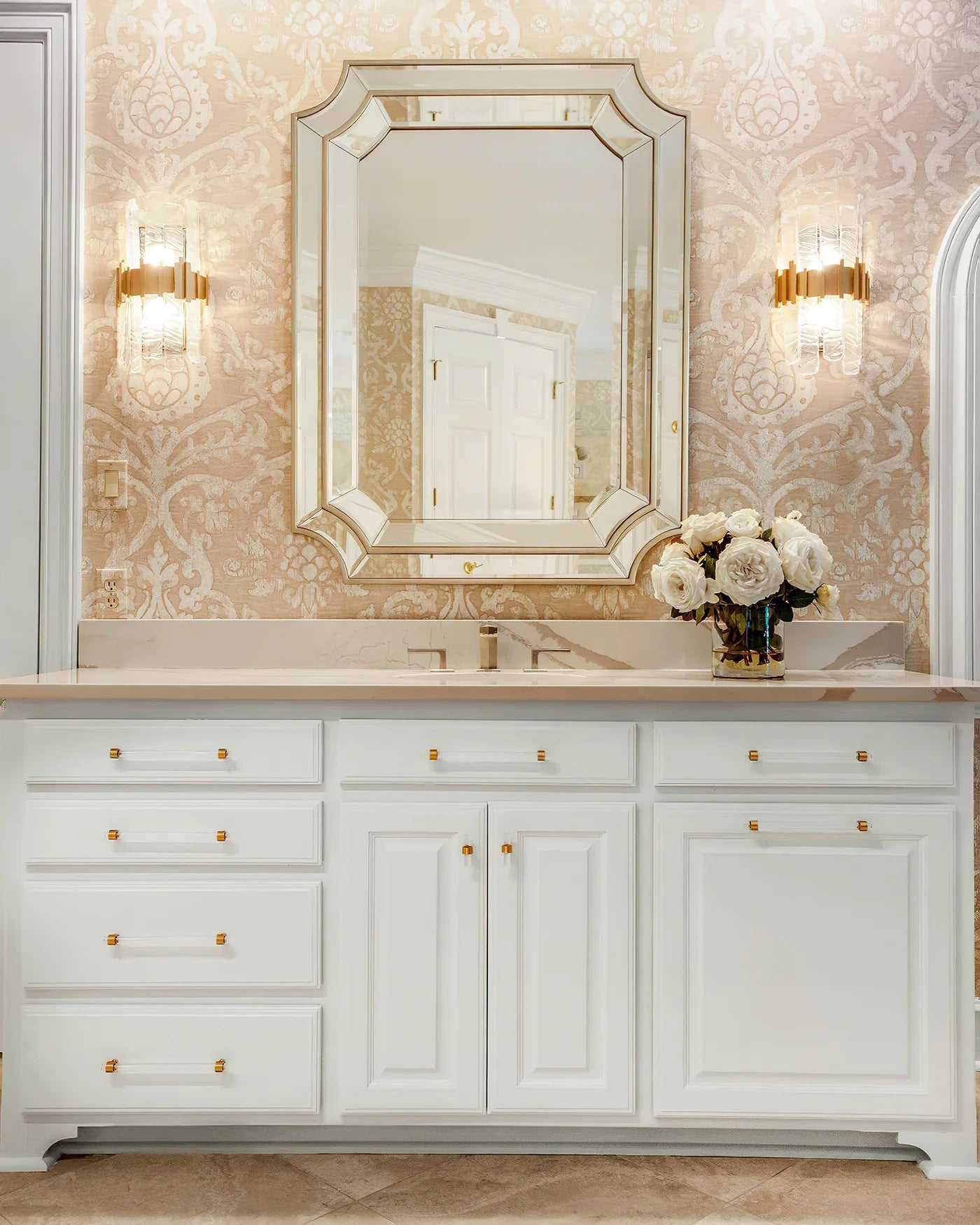 Bathroom wall lighting is often mounted above and/or alongside the mirrored medicine cabinet or bathroom mirror. This placement provides ample bright light for many bathroom tasks, including grooming and applying lotions and makeup.
