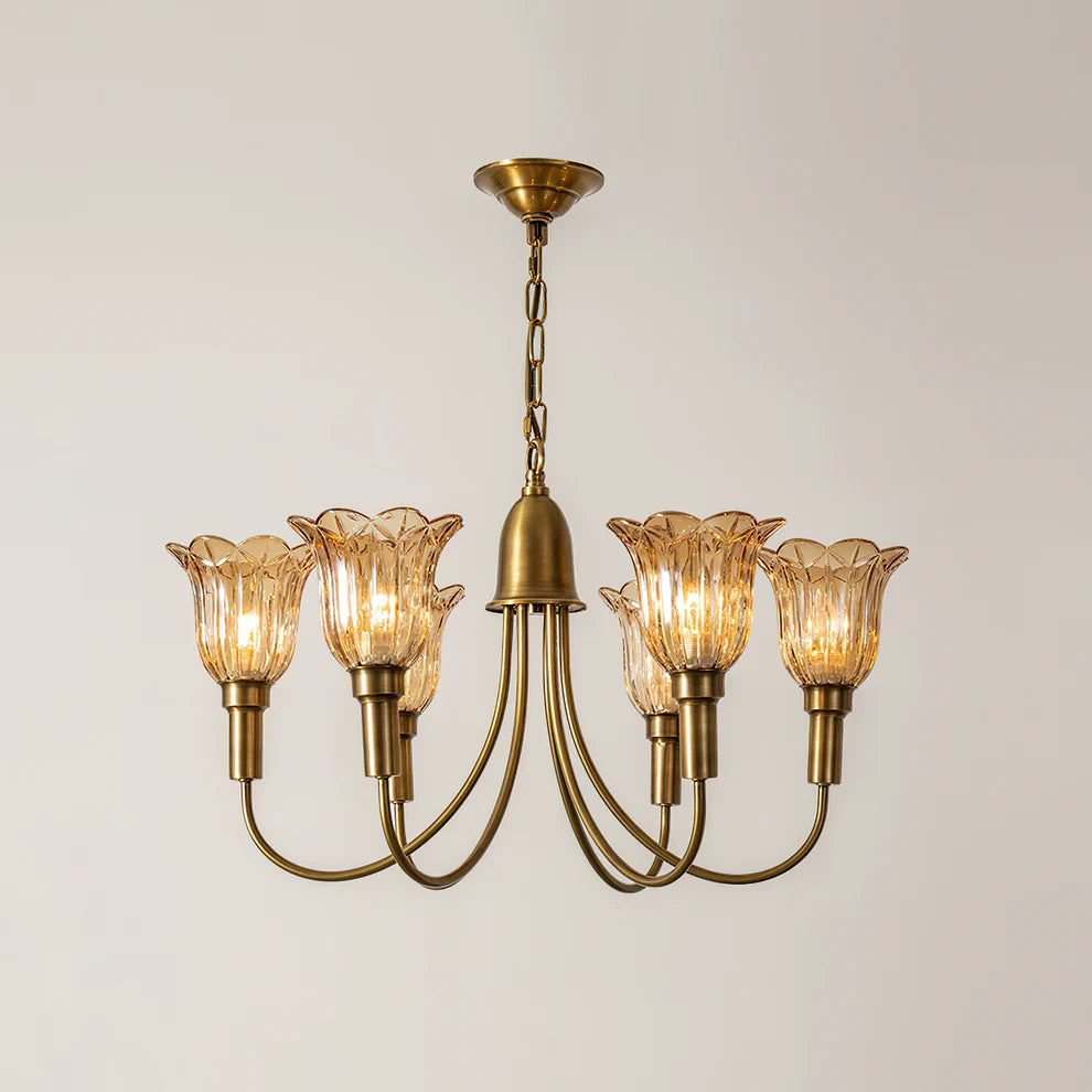 Crafted from antique brass, the Columbia Brass Chandelier exudes an elegant, vintage charm. Suspended from a decorative chain, its Art Deco style glass shade adds a touch of sophistication. Experience the timeless beauty and warm glow this chandelier brings to any space.