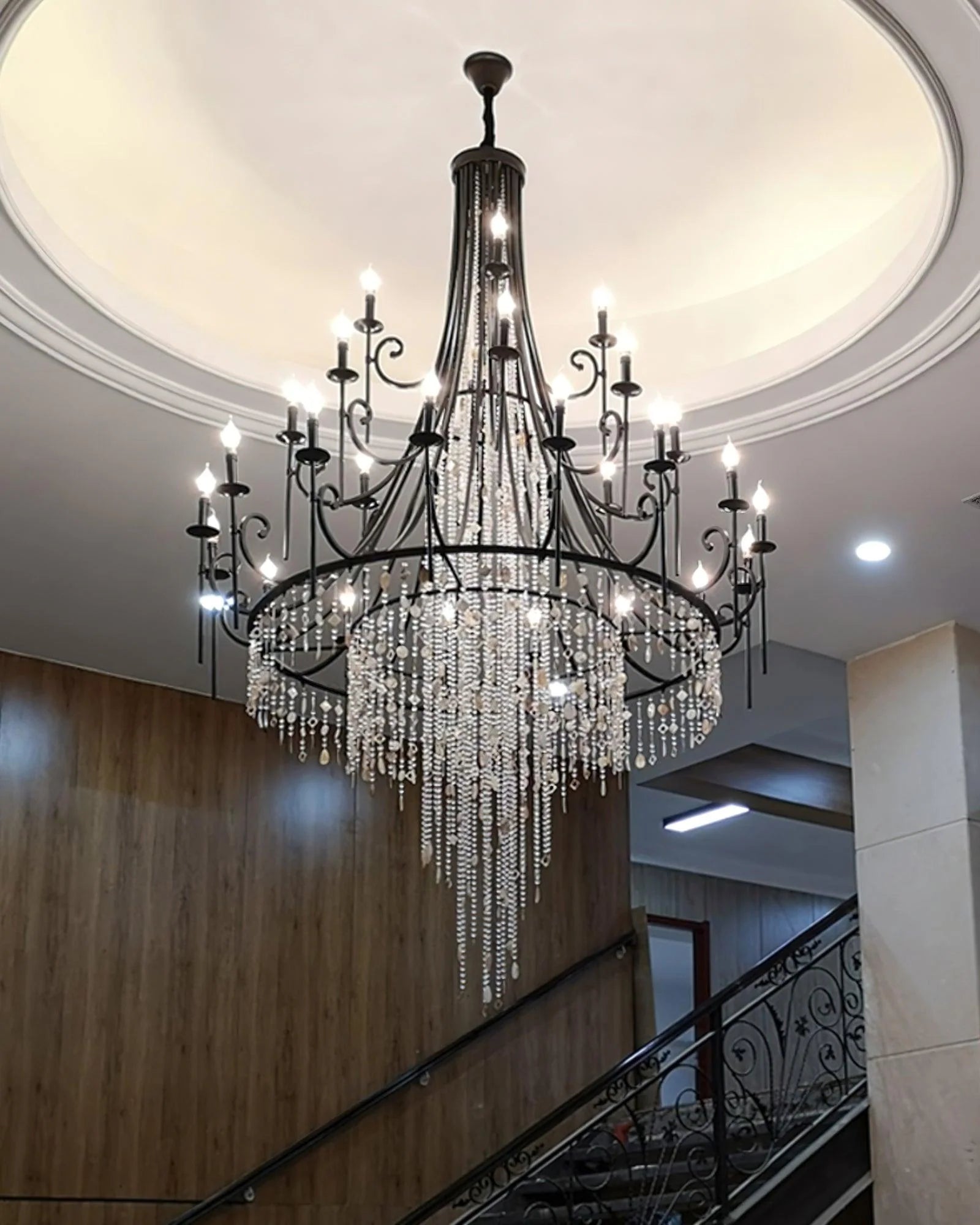 The design of Crystal Cascade Chandelier is inspired by the natural flow and light effects of waterfalls. Its exquisite golden frame is hung with multiple layers of crystal clear crystal bead chains, simulating the shape of a waterfall, creating a luxurious and majestic visual effect. Designed to bring majestic and elegant illumination to any space, this chandelier emits a soft yet brilliant glow.