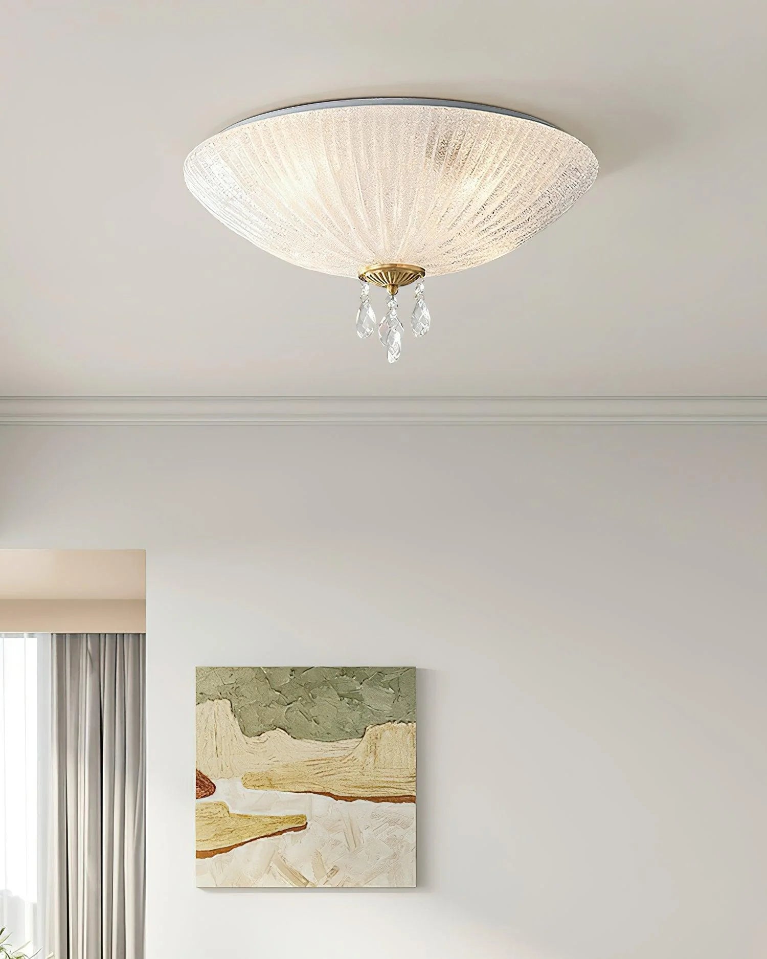 The textured glass shade captures the essence of delicate flower petals. The hanging crystal droplets enhance its sophistication, making it the perfect centerpiece for any room seeking a luxurious feel.
