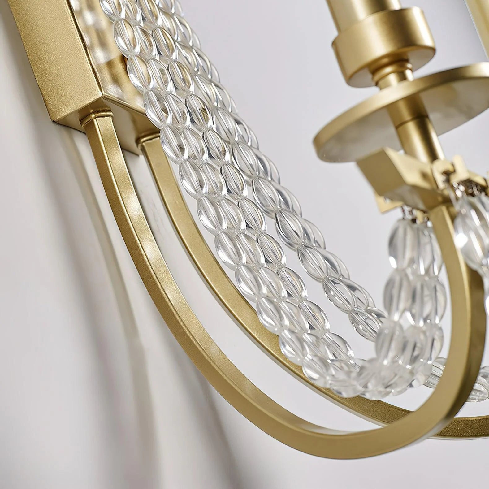 Blending the grandeur of the Gilded Age with the fluidity of modern design. Its elegant gold frame and cascading crystal embellishments reflect light in a play of shadows. Its design is perfect for creating a glamorous ambience in an entryway, hallway, or anywhere elegance is desired.