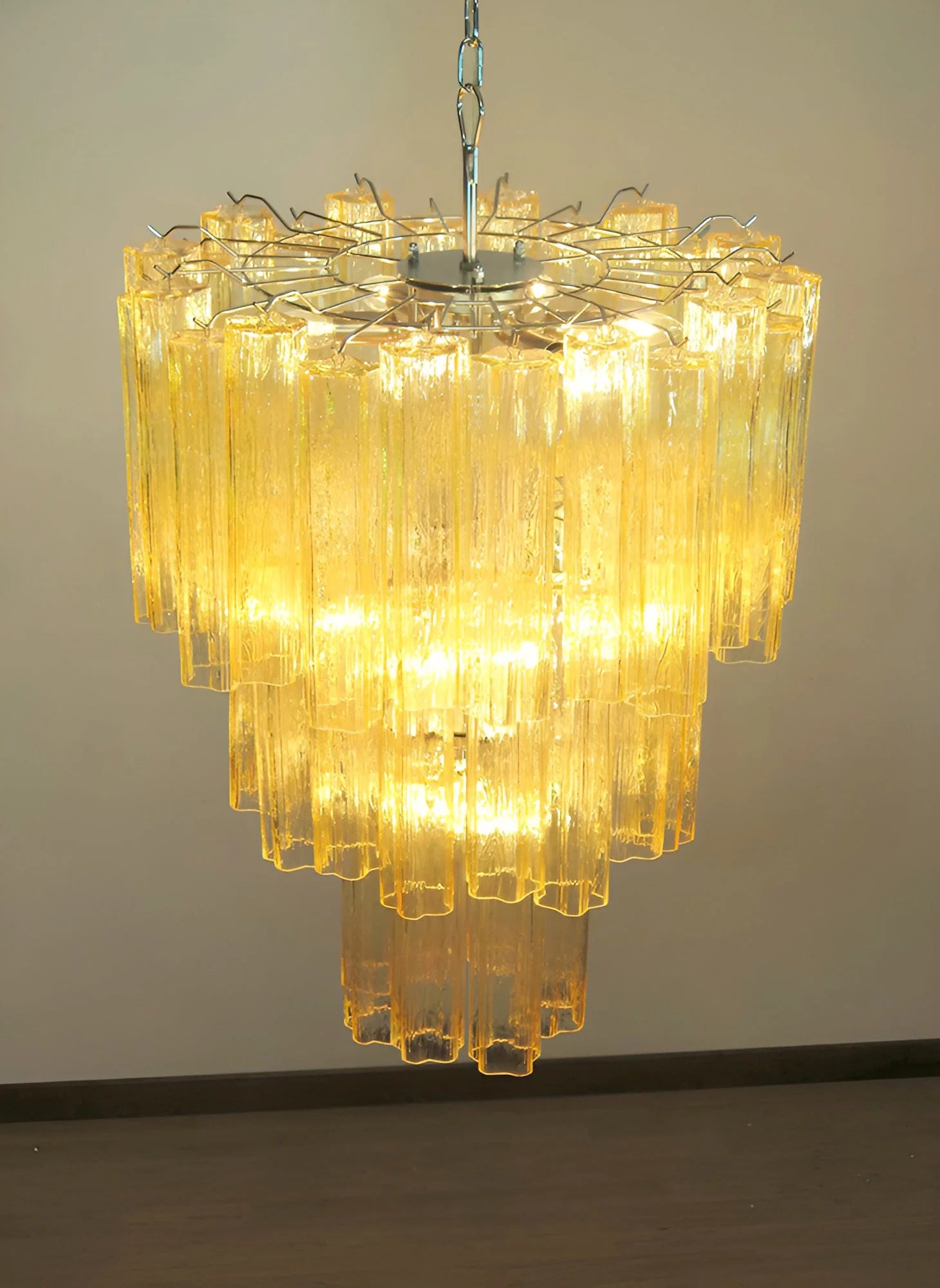 The Elegant Yellow Murano Tube Chandelier is a finely handcrafted lighting fixture featuring vibrant yellow glass star tubes that emit a captivating glow. This chandelier combines artistic design with functional illumination, enhancing any interior with a sophisticated and luxurious atmosphere. Perfect as a centerpiece, it transforms your space by blending exquisite craftsmanship with mesmerizing light effects.
