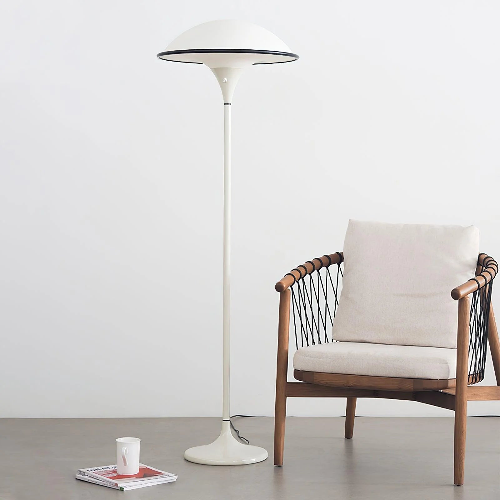 This floor lamp is a testament to minimalist design, where form and function meet in an elegant display. Its wide, dish-shaped shade casts a broad, diffused light, perfect for illuminating larger spaces with a soft glow that enhances the ambience without overpowering it. The sleek, streamlined pole and stable base maintain a low profile, making this lamp a versatile addition to any room.