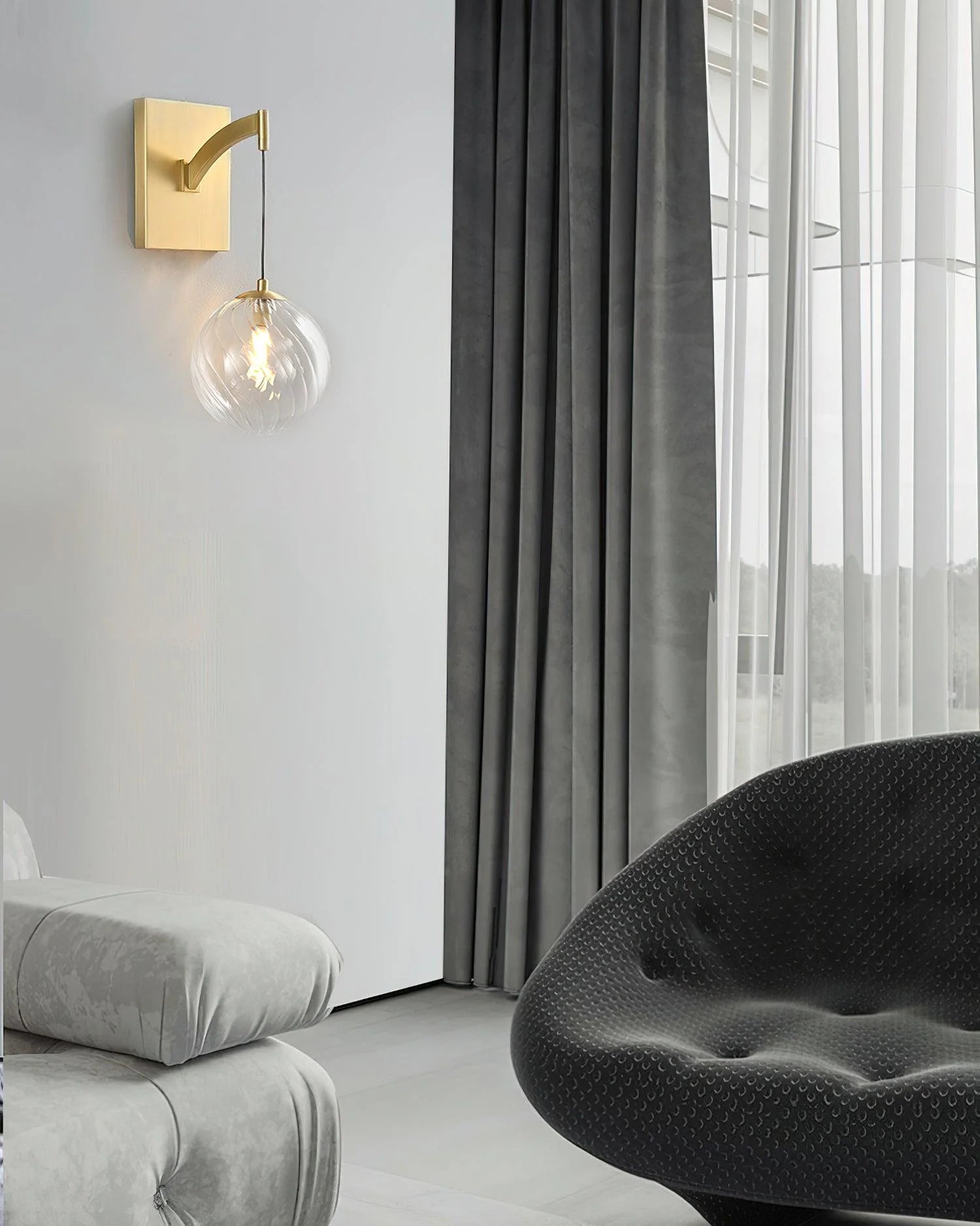The brass fixture is framed by an elegant curved arm, providing a luxurious base to the fixture, while the delicate glass globe is embellished with subtle swirls, adding a touch of ethereal beauty. This wall light is inspired by the golden age of glamour, reimagined for modern interiors.