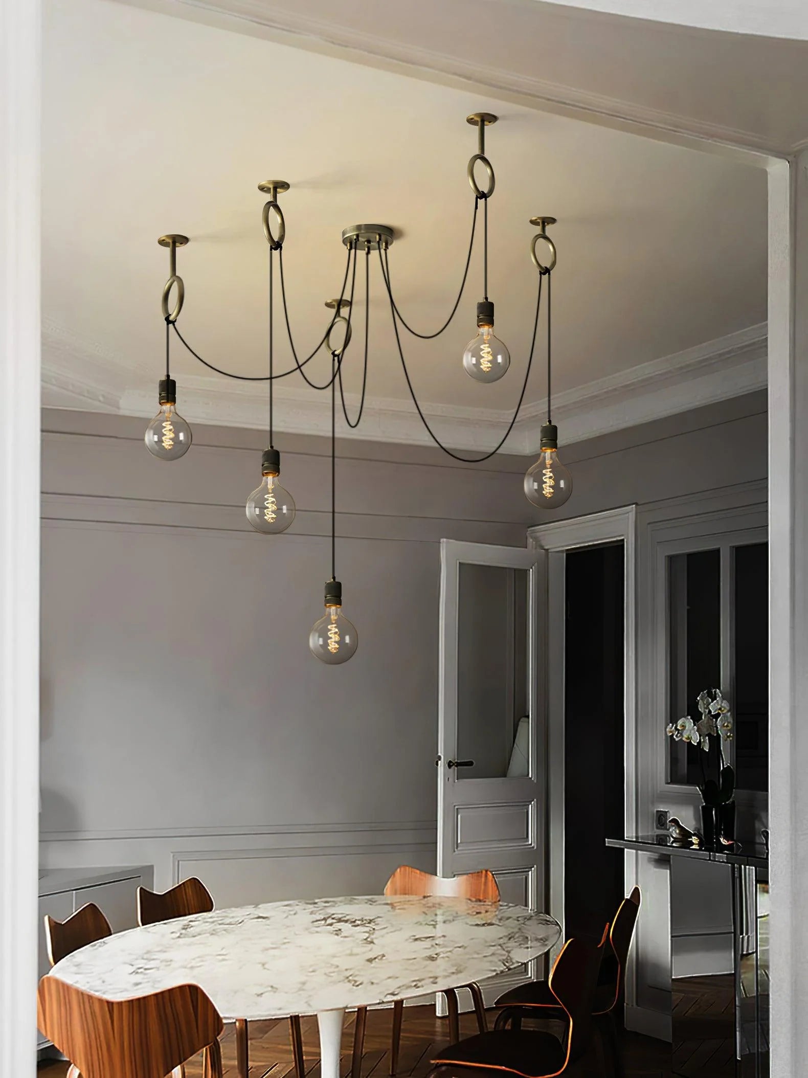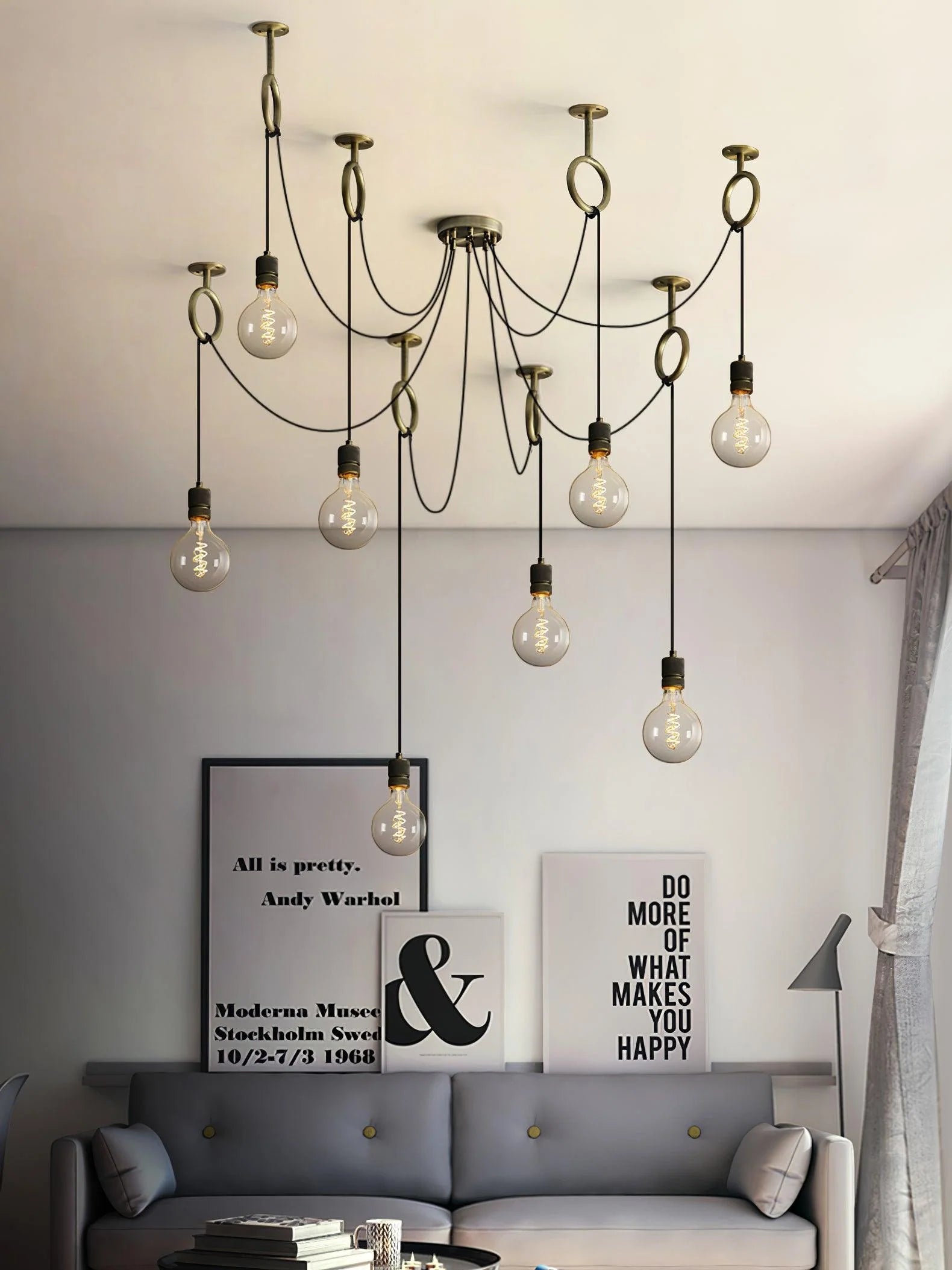 Decorate your room and show your modern and industrial atmosphere with this Industrial Spider Chandelier. Use of different types and finishes of bulb can dramatically alter the mood and atmosphere providing bright light in working areas and soft tones in areas of relaxation. Each wire is 59 inch, can adjusted droop length and modeling by DIY.