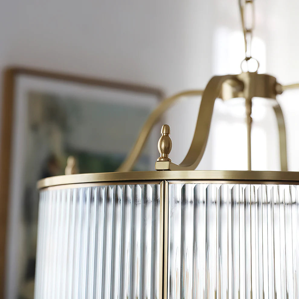 Elevate your space with the Lambeth Glass Chandelier, designed to impart a refined and timeless charm. Its ribbed glass panels catch the light beautifully, enhanced by an gold finish that radiates warmth. Adjustable chain and gold cable provide flexible installation options, making it perfect for stairwells, hallways, dining rooms, or living areas.