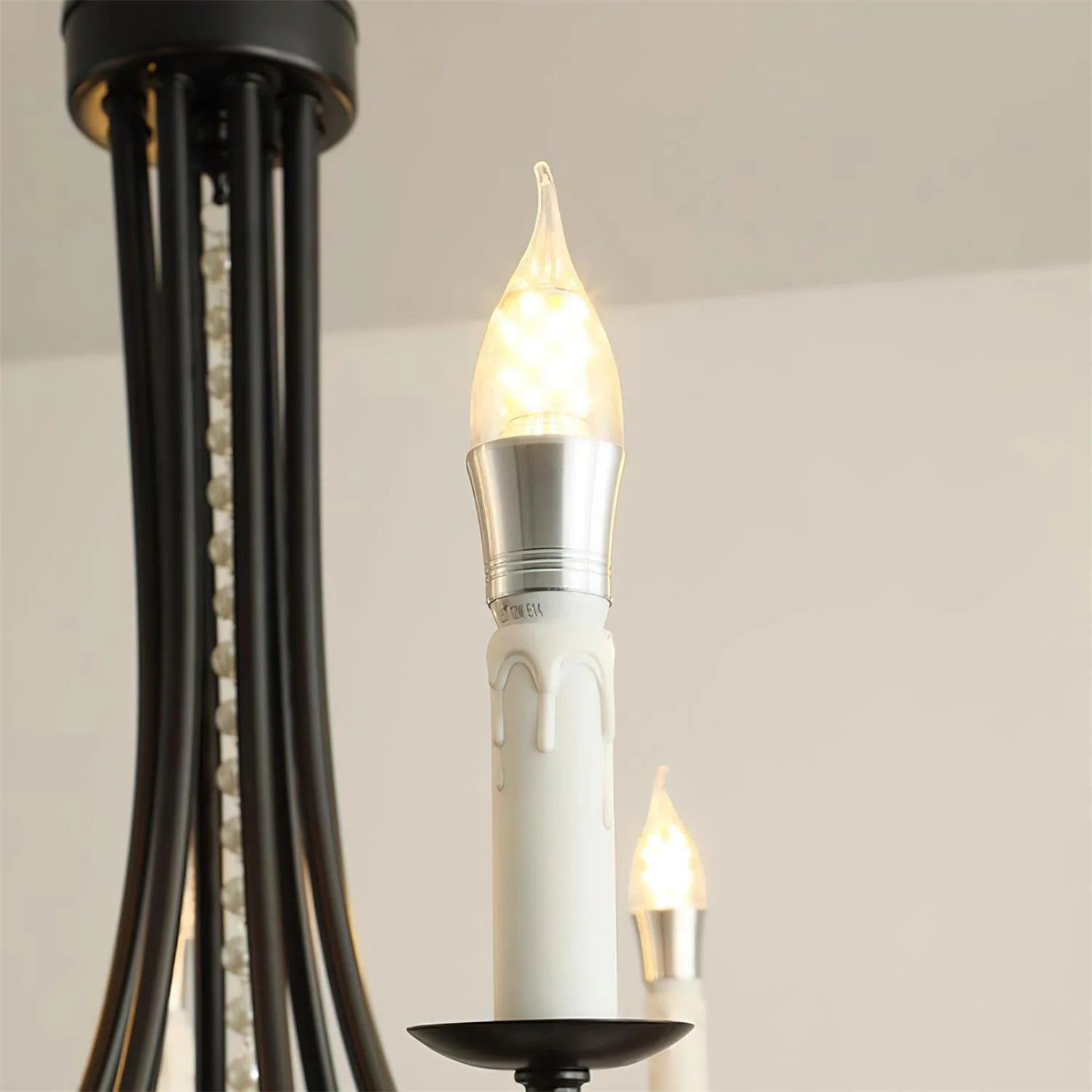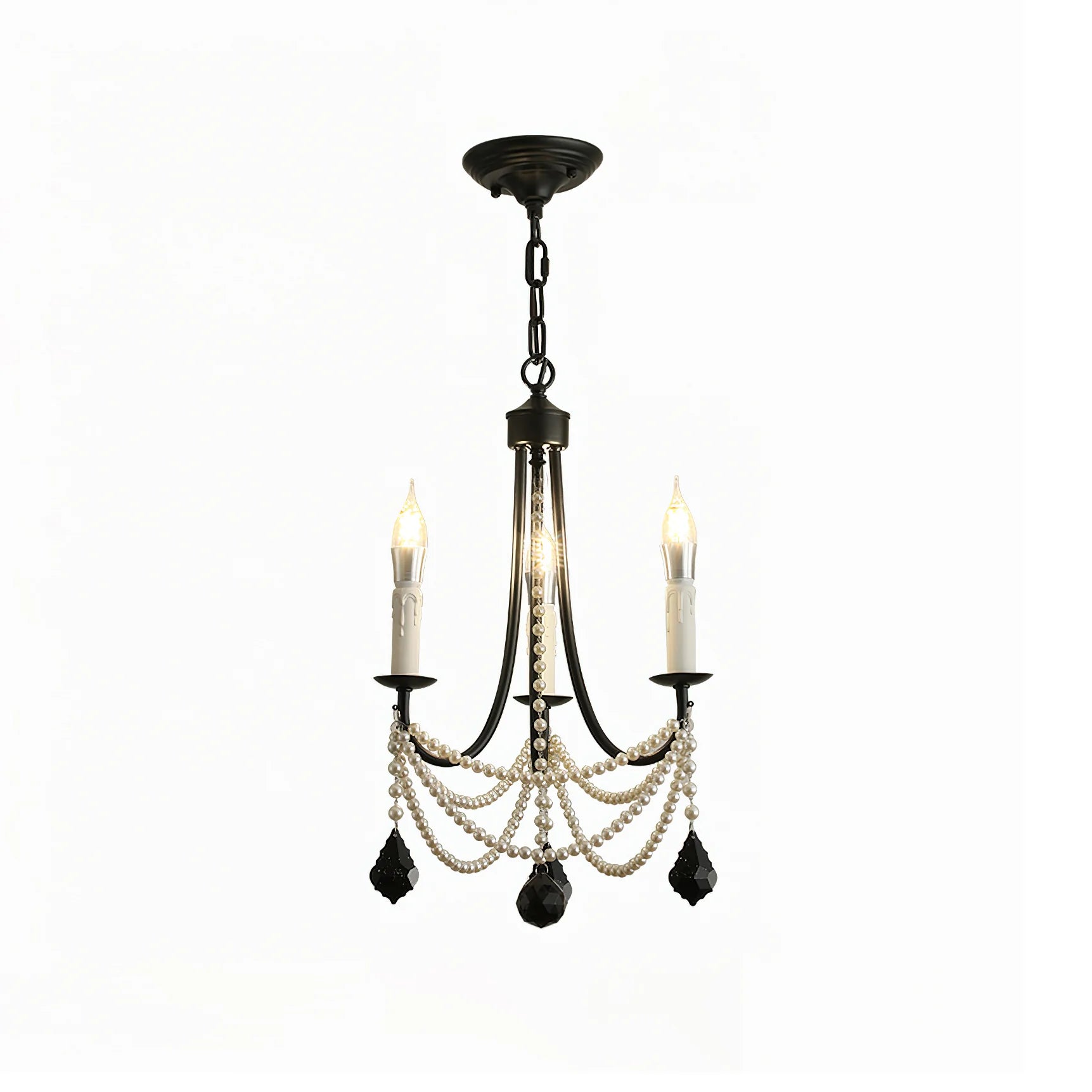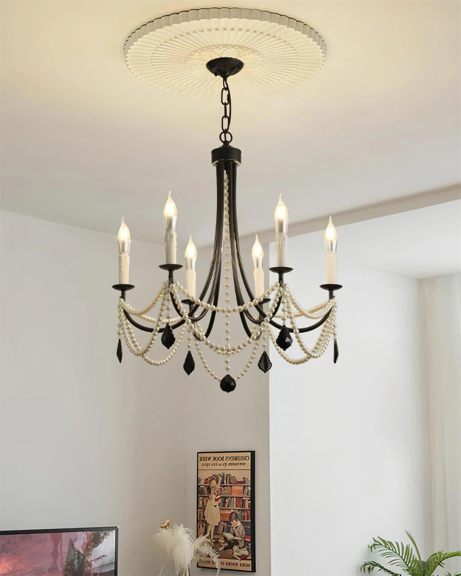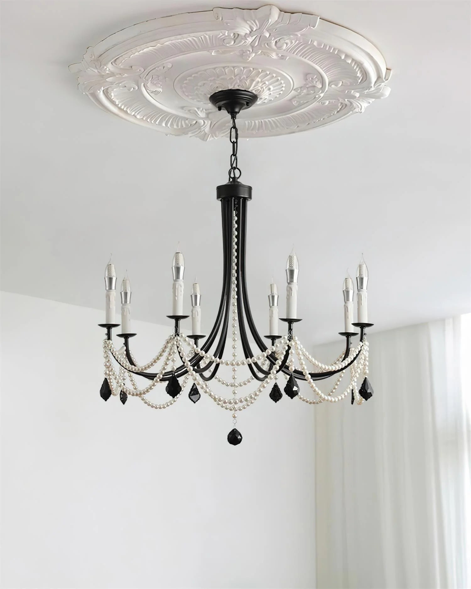 A dramatic fusion of vintage elegance and modern edge, the Beaudra Chandelier captivates with its contrast of matte black arms, cascading faux pearls, and bold black crystal drops. Candle-style lights evoke classic grandeur, while the draped beading adds a soft, ornamental rhythm. Perfect over a dining table or in an entryway that deserves a touch of theatrical flair, Beaudra is unapologetically expressive—an instant icon in any space.