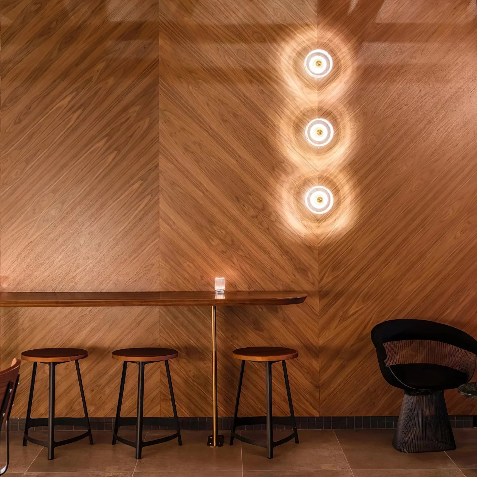 Troducing the Marble Aura Wall Lamp - a masterpiece of subtle simplicity. Precisely cut thin marble envelops the light source, creating a soft yet vibrant aura of concentric circles. The included LED light boasts a unique mirrored gold hue, evoking the illusion of a floating golden sphere. Originally designed for kitchens and bathrooms, this stone wall lamp adds a touch of sophistication to any living space.