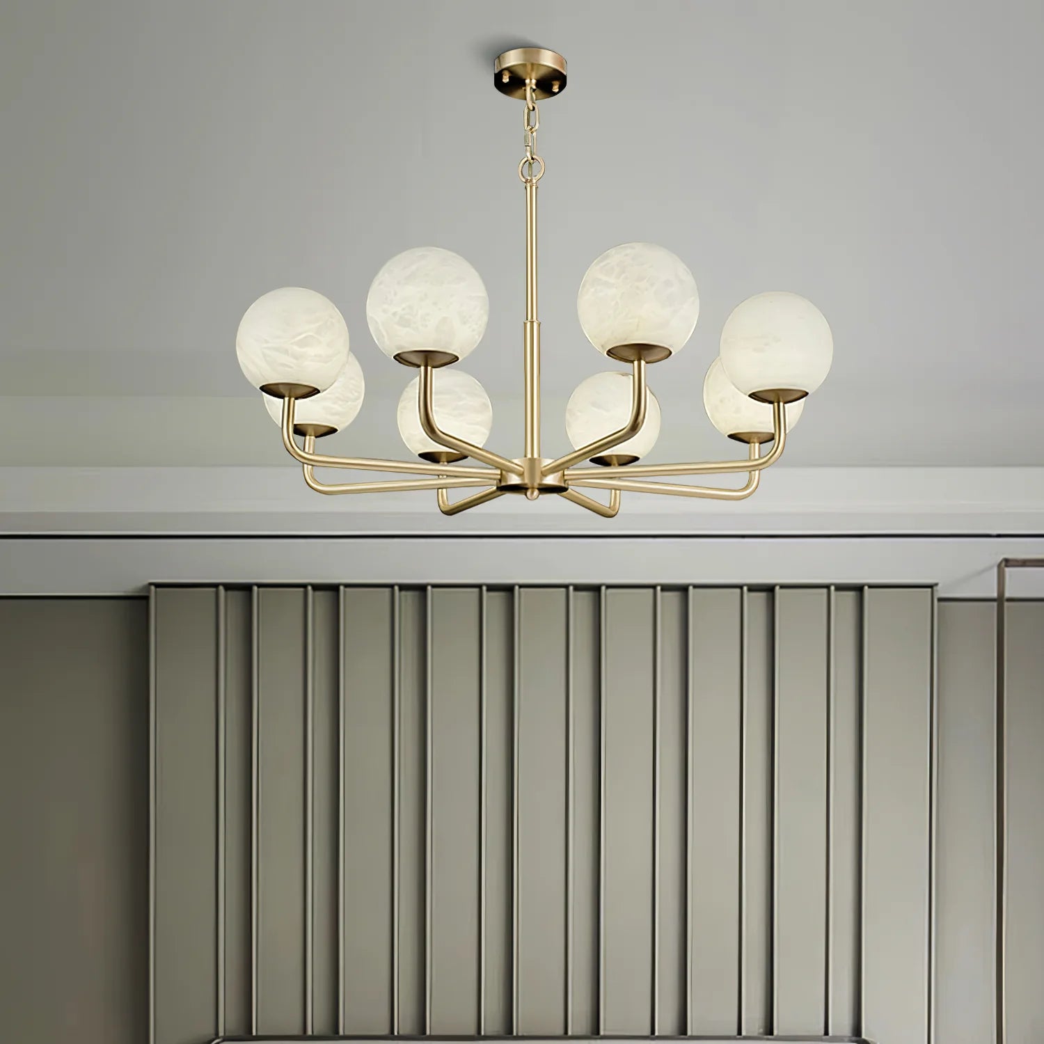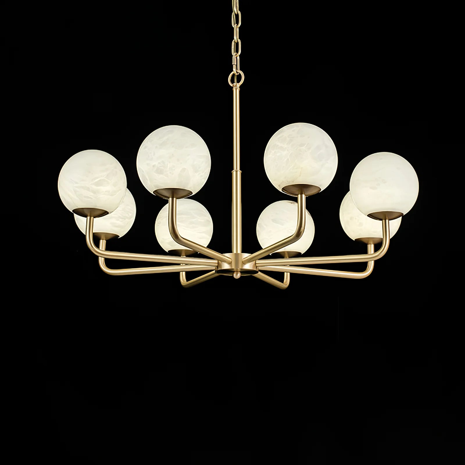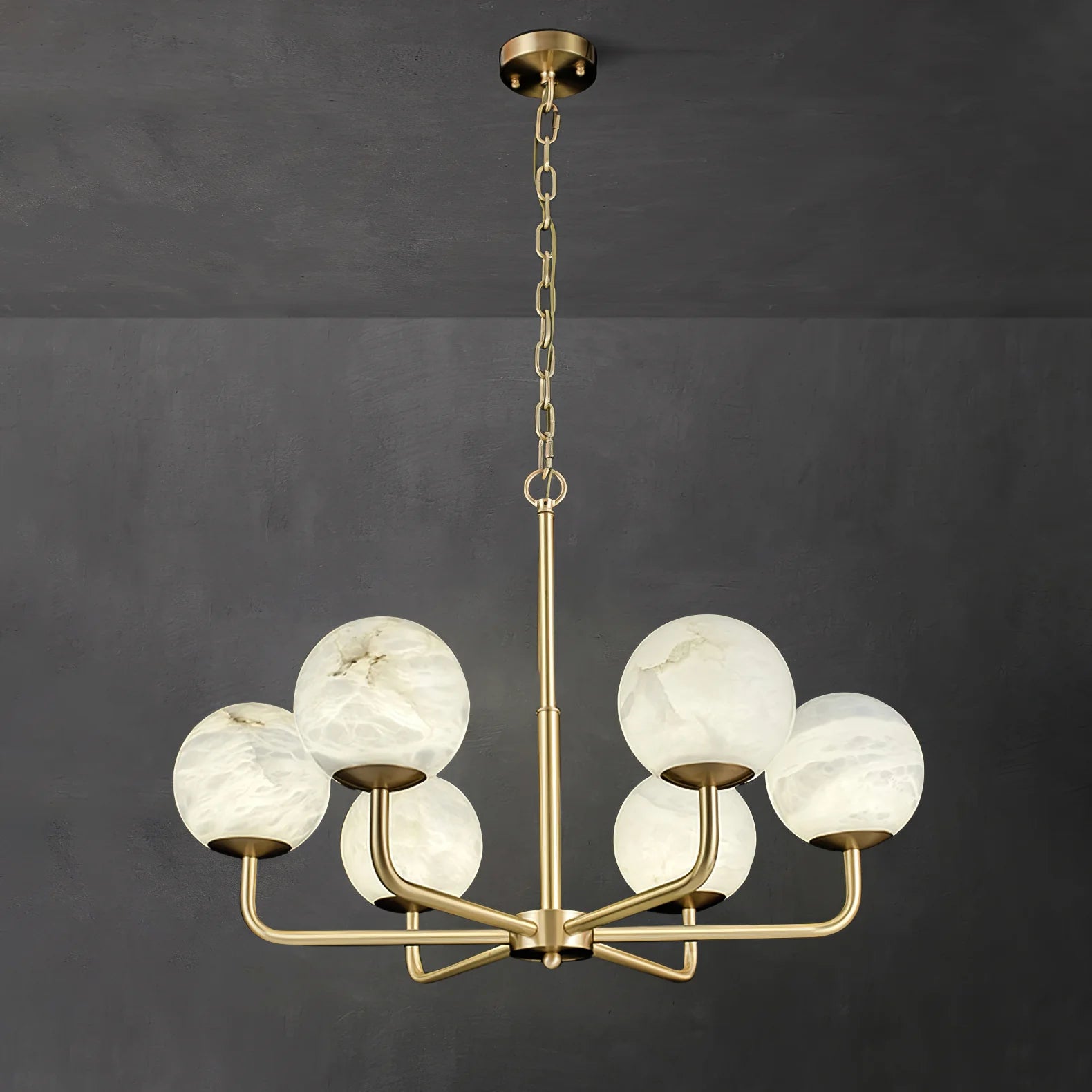 The Maytoni Erich Chandelier at Dekorfine exudes timeless elegance with its stunning combination of brass and alabaster. Featuring six gracefully curved arms and alabaster globe shades, this chandelier emits a soft, diffused glow, creating a warm and inviting ambiance. The luxurious brass finish adds a touch of sophistication, making it a standout piece for dining rooms, living spaces, or grand entryways. With its harmonious balance of modern design and classic materials, the Maytoni Erich Chandelier enhances any interior with refined beauty.