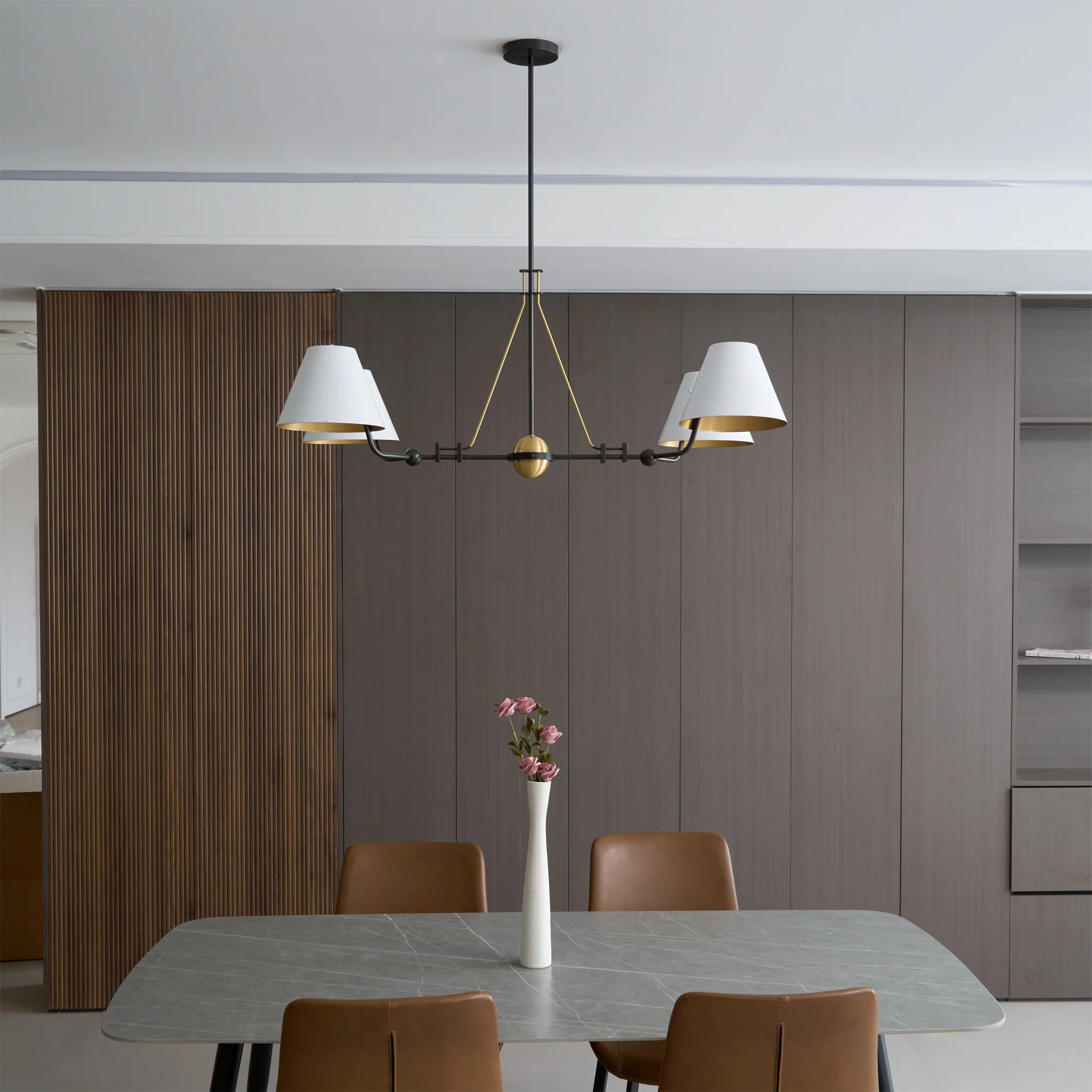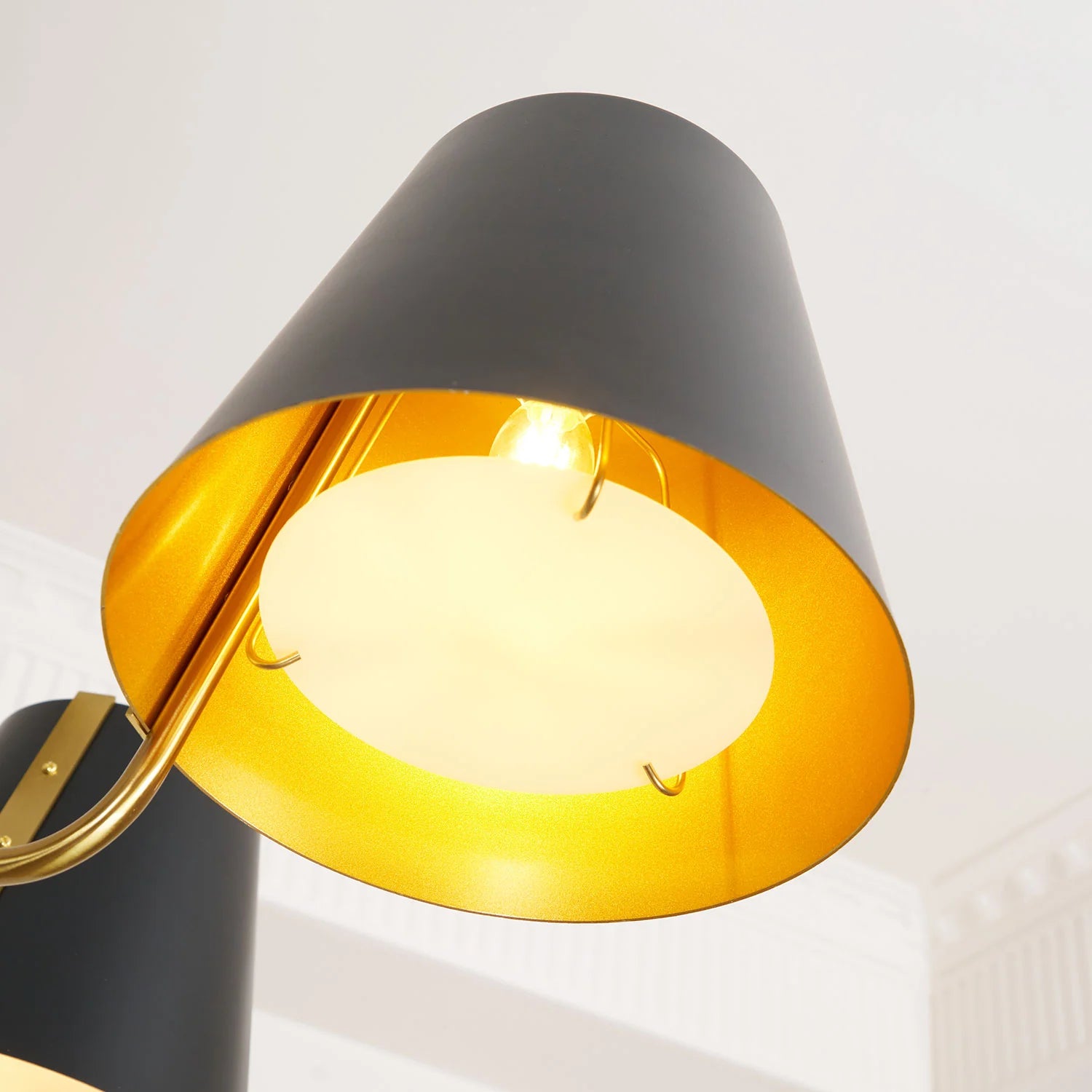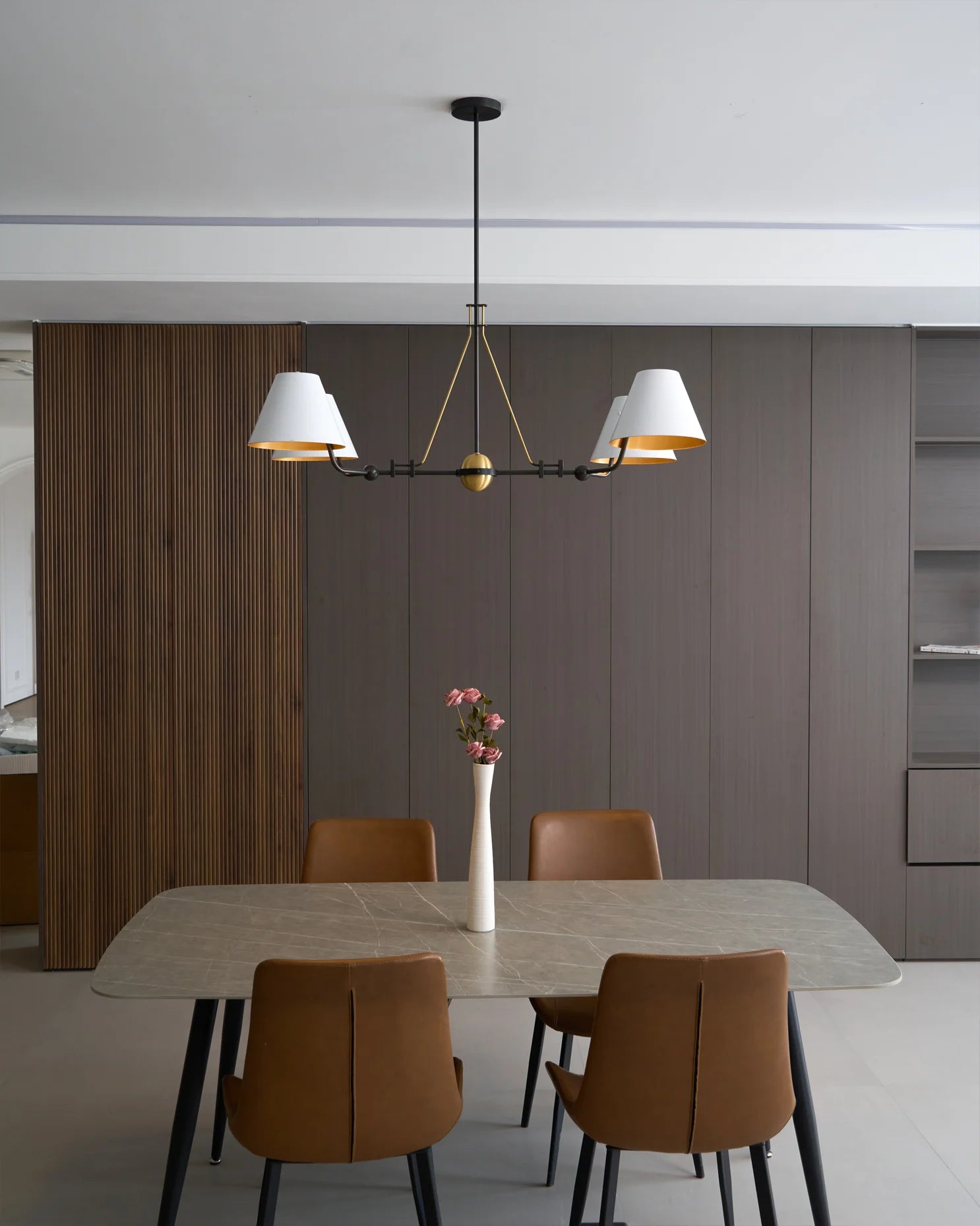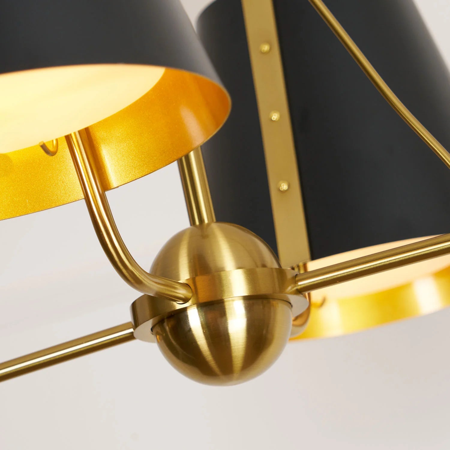 The "Midnight Symphony Chandelier" is designed to evoke the elegance and mystery of a classical music performance under the cover of night. Its multiple dark-hued shades, arranged in a dynamic, sweeping formation, mimic the movement and harmony of an orchestra. The golden interior lining of each shade casts a warm, inviting glow, perfect for enriching dining rooms or sophisticated entryways with a touch of drama and sophistication.