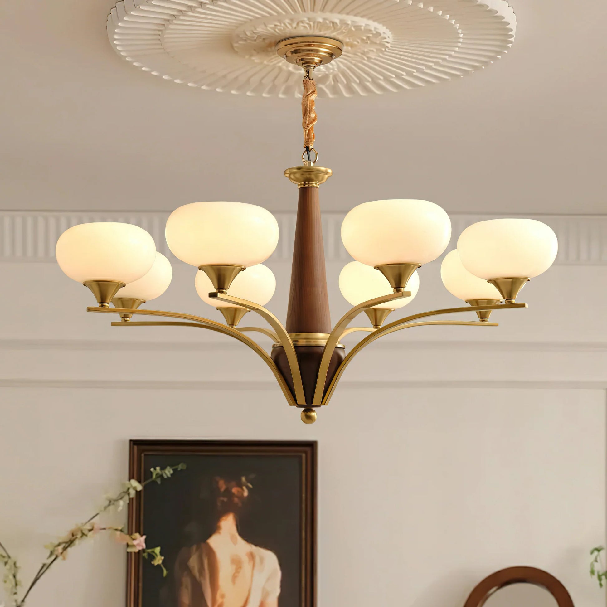 Pointed Chandelier stands out with its unique geometric shape and symmetrical design. The lamp arm extends elegantly from the center, creating a radial visual effect, as if pointing to light in all directions. The milky white round lampshade diffuses softly like a halo, bringing a warm atmosphere, while the delicate combination of metal and wood adds a perfect fusion of modernity and natural atmosphere to the entire lamp.