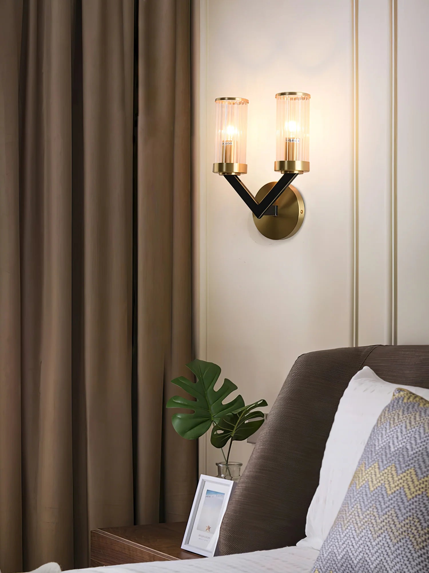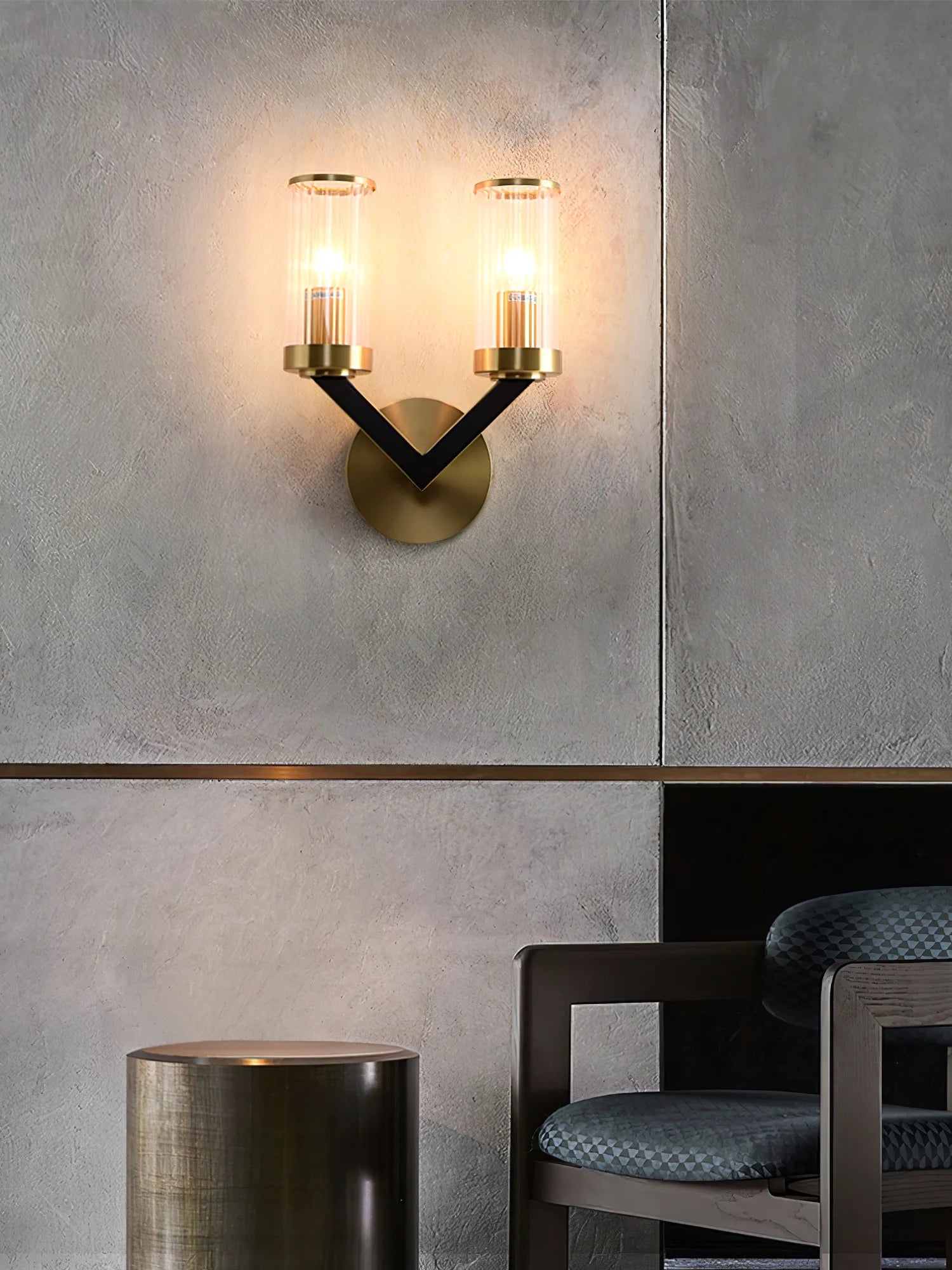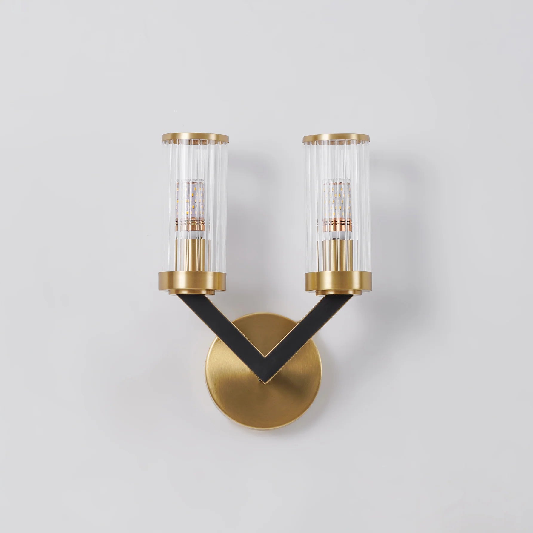 The Reevete Wall Lamp balances sophistication with simplicity. The low-profile traditional silhouette is elevated by a wealth of elegant clear glass cylinders. Each glass is secured with brass matching the frame's luxurious finish and finished with a corresponding metal band at the top.