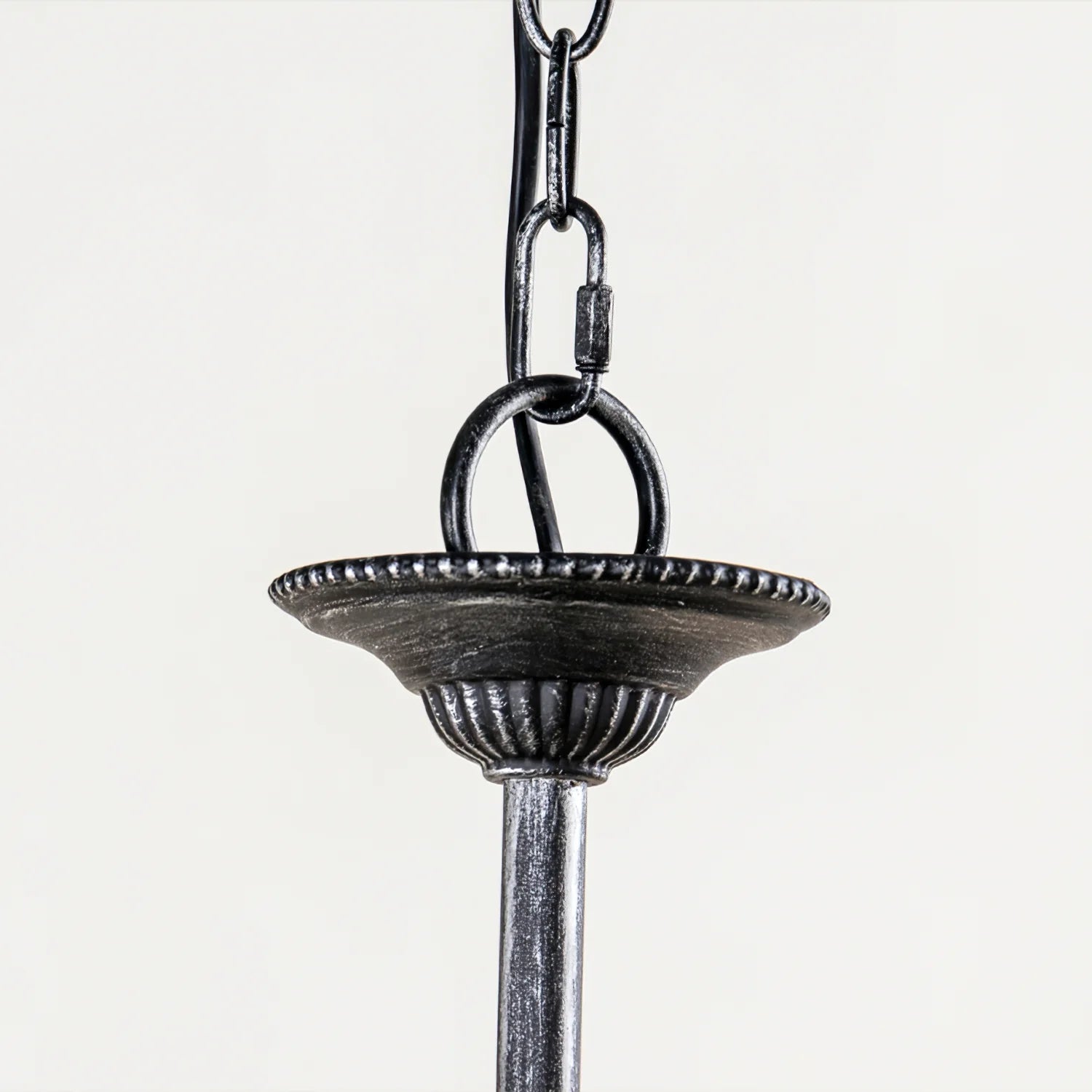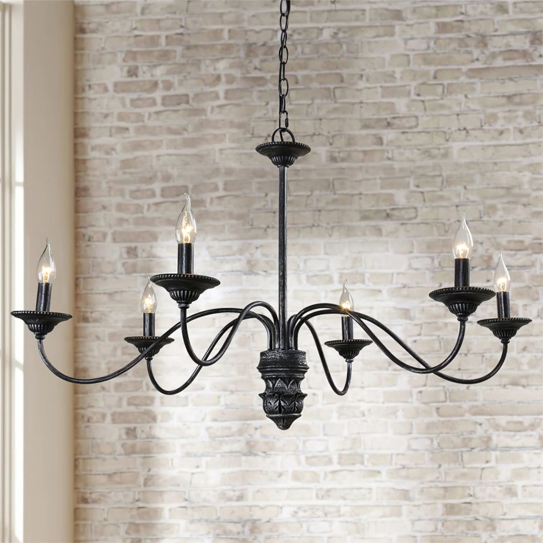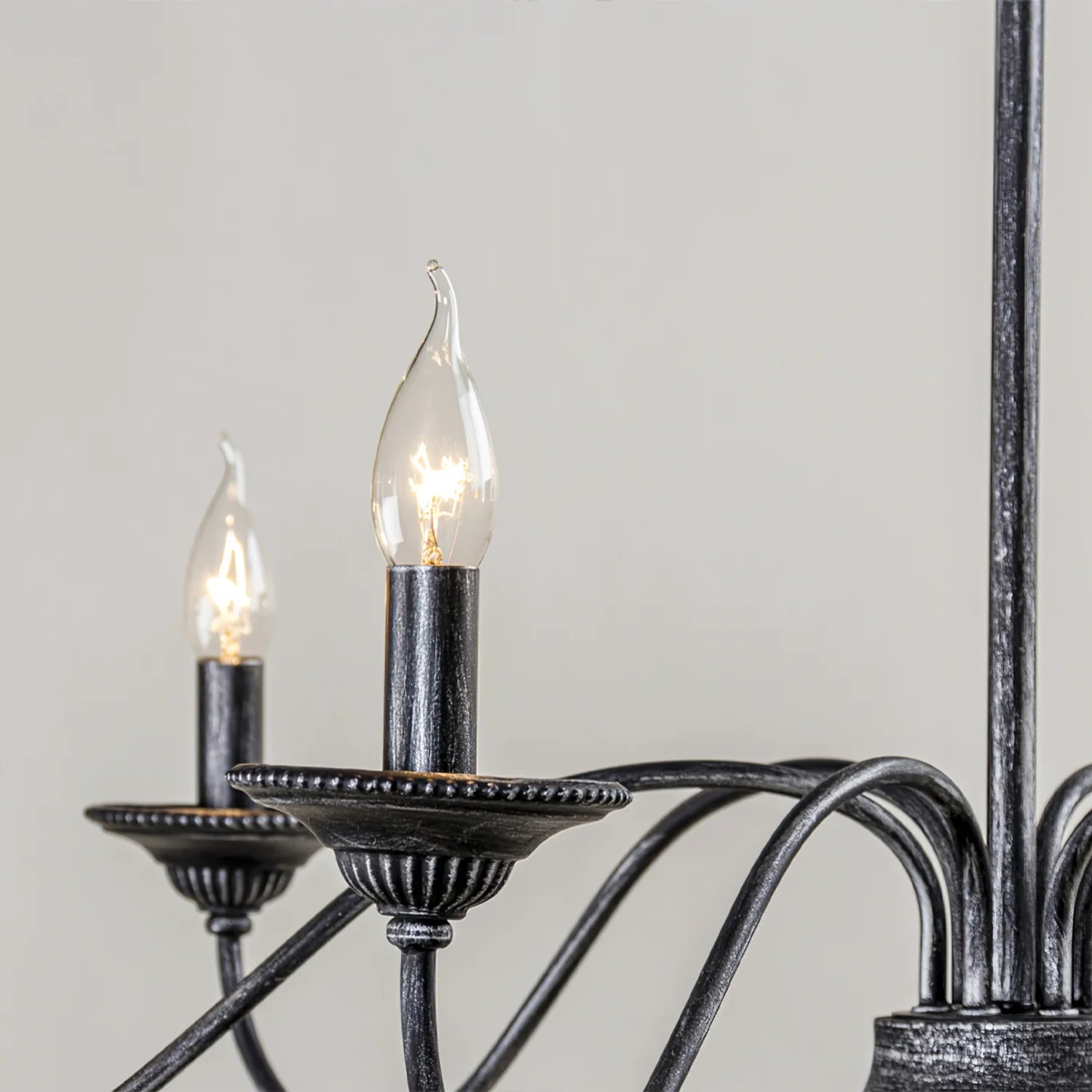 The Rohan Chandelier from Dekorfine is an elegant and timeless piece designed to add a touch of vintage charm to any space. Its classic, ornate structure features six gracefully curving arms, each topped with a candle-style light, creating a striking silhouette that combines sophistication and functionality. The black metal finish gives the chandelier a bold and dramatic look, while the intricate detailing on the central column enhances its vintage appeal. This piece is perfect for creating a warm and inviting atmosphere, whether in a traditional dining room, living area, or entryway.