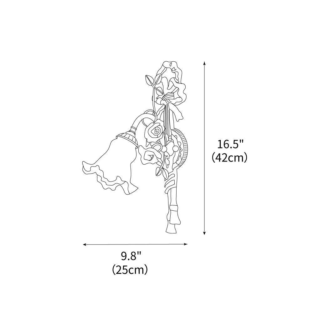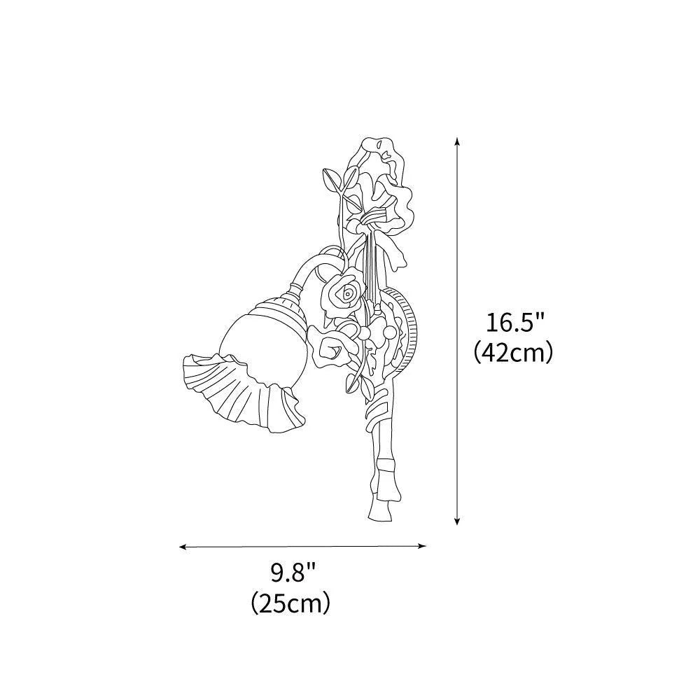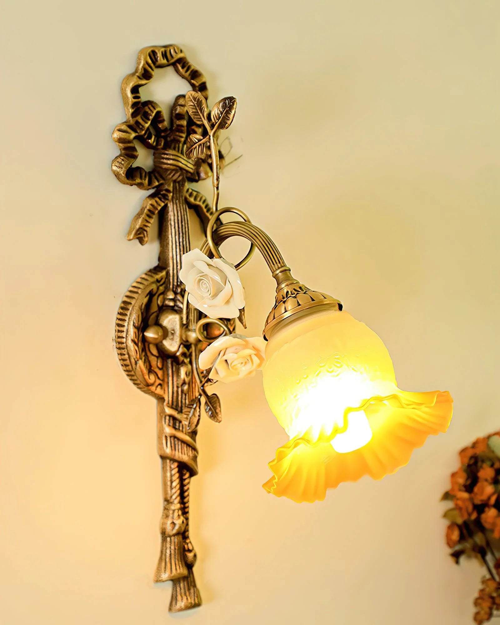 The Rosalie Floral Wall Sconce is inspired by the romantic elegance of a blooming garden. This beautiful wall sconce features a sophisticated brass frame adorned with delicate porcelain roses and leaves. The frosted glass shade resembles a gently blooming flower, adding a touch of whimsy and elegance.