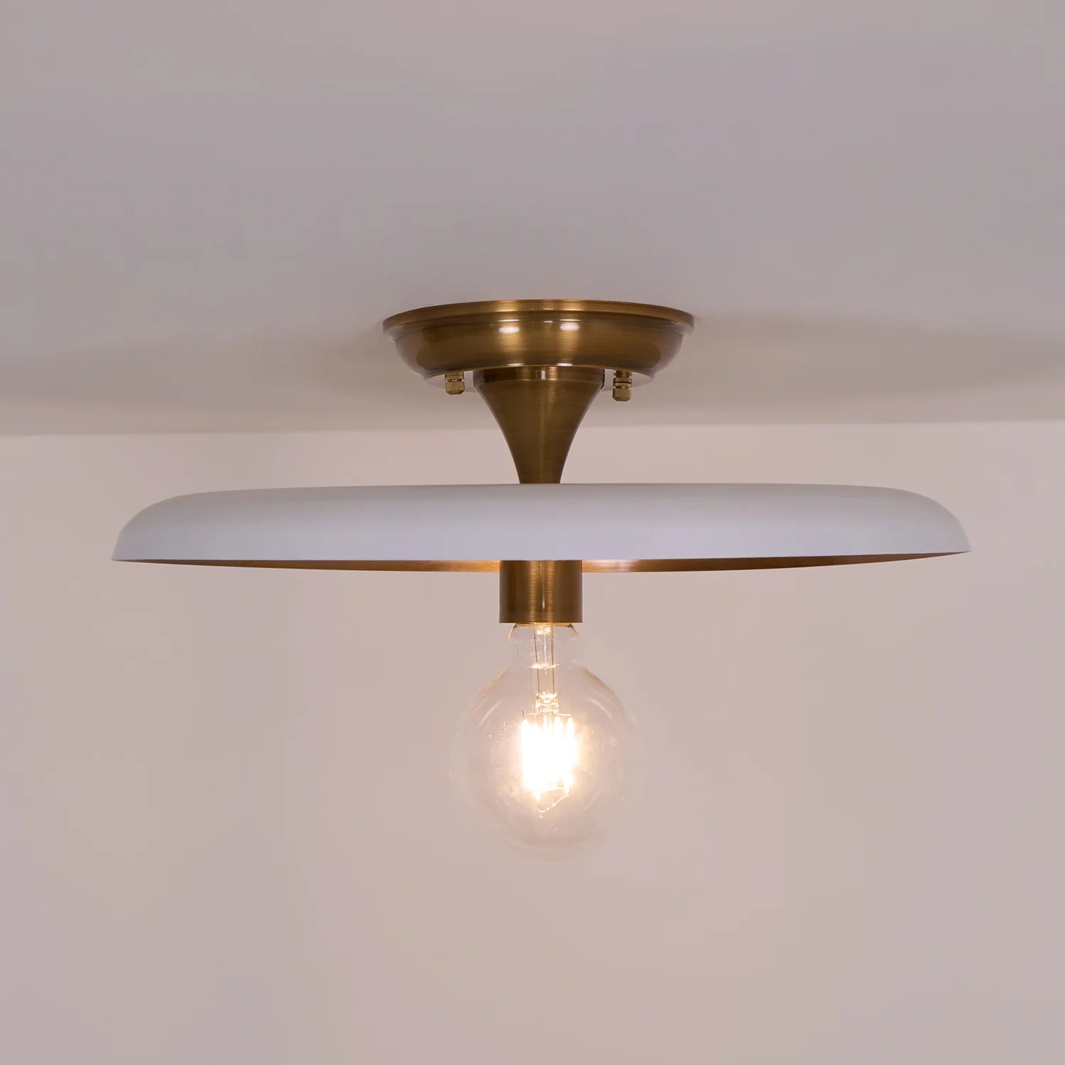 Featuring a sleek round iron shade with a warm gold finish, this semi-recessed fixture is striking with its exposed filament bulb, adding a touch of industrial charm. Light reflects softly inside the wide disc, creating a warm, inviting glow. Perfect for adding a modern touch to a living room, hallway or bedroom, the Solara Disc Ceiling Light combines simplicity with sophistication to elevate any modern space with understated elegance.