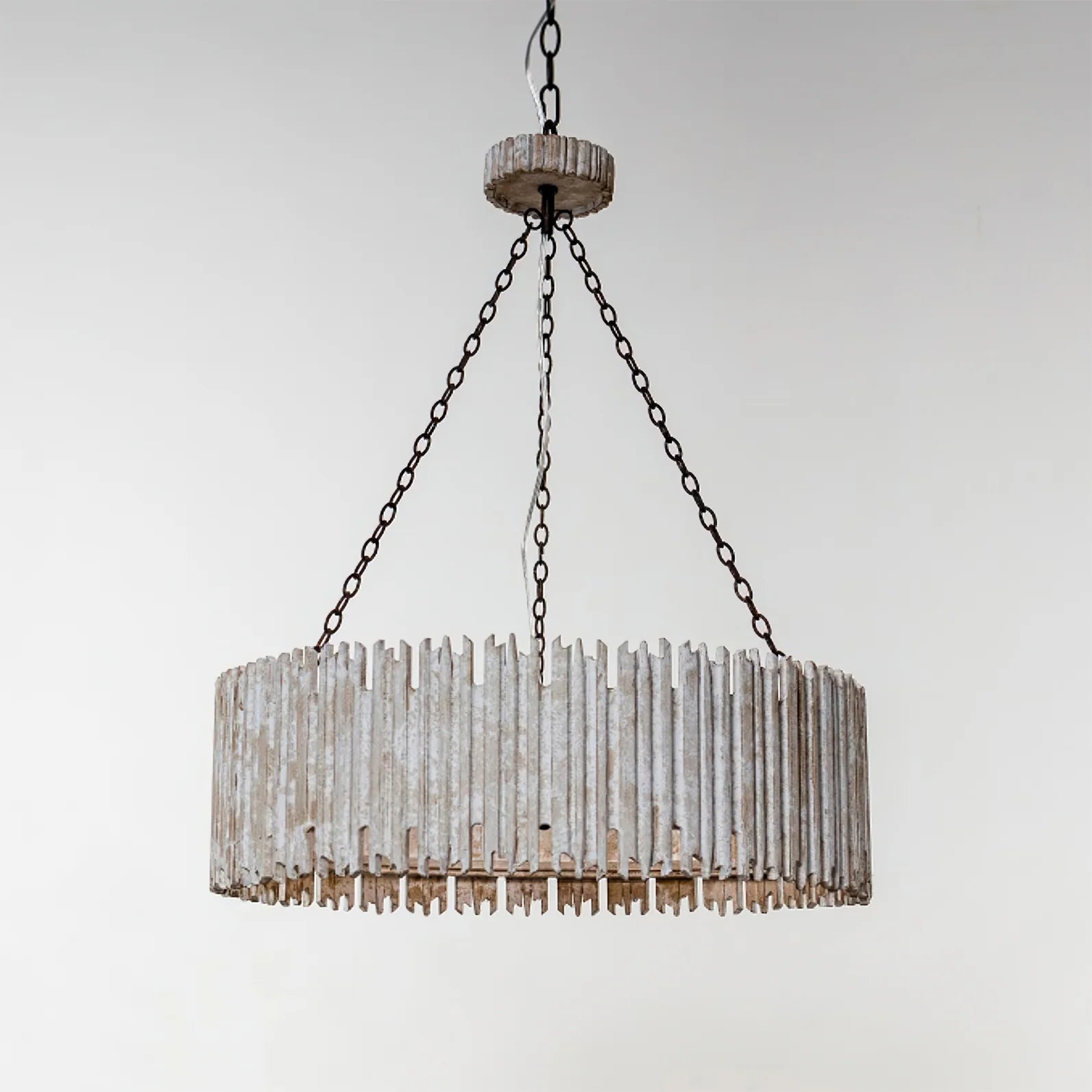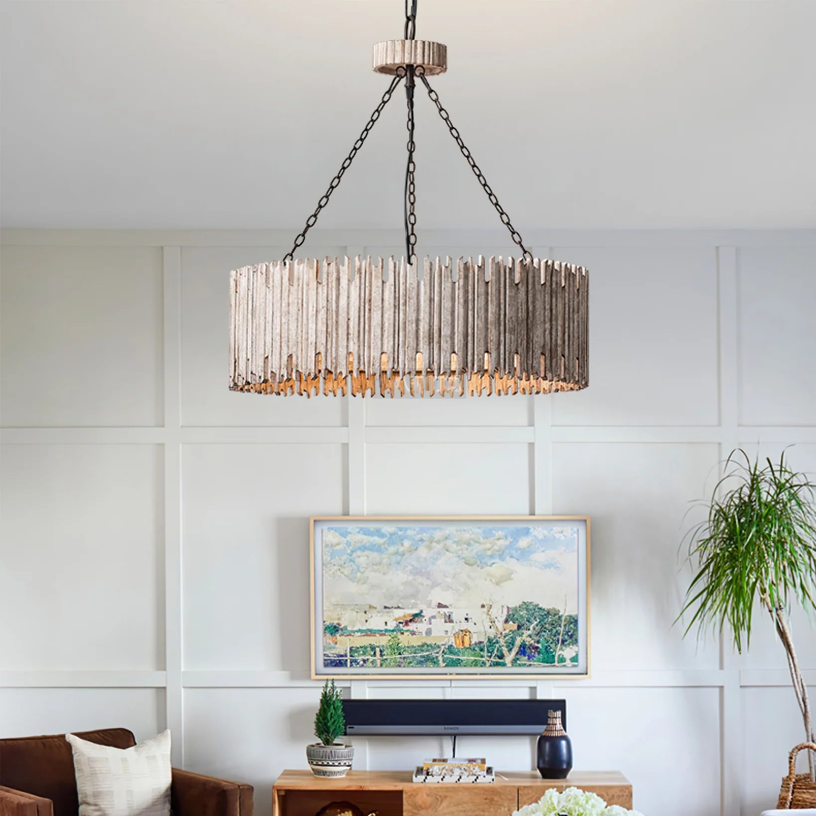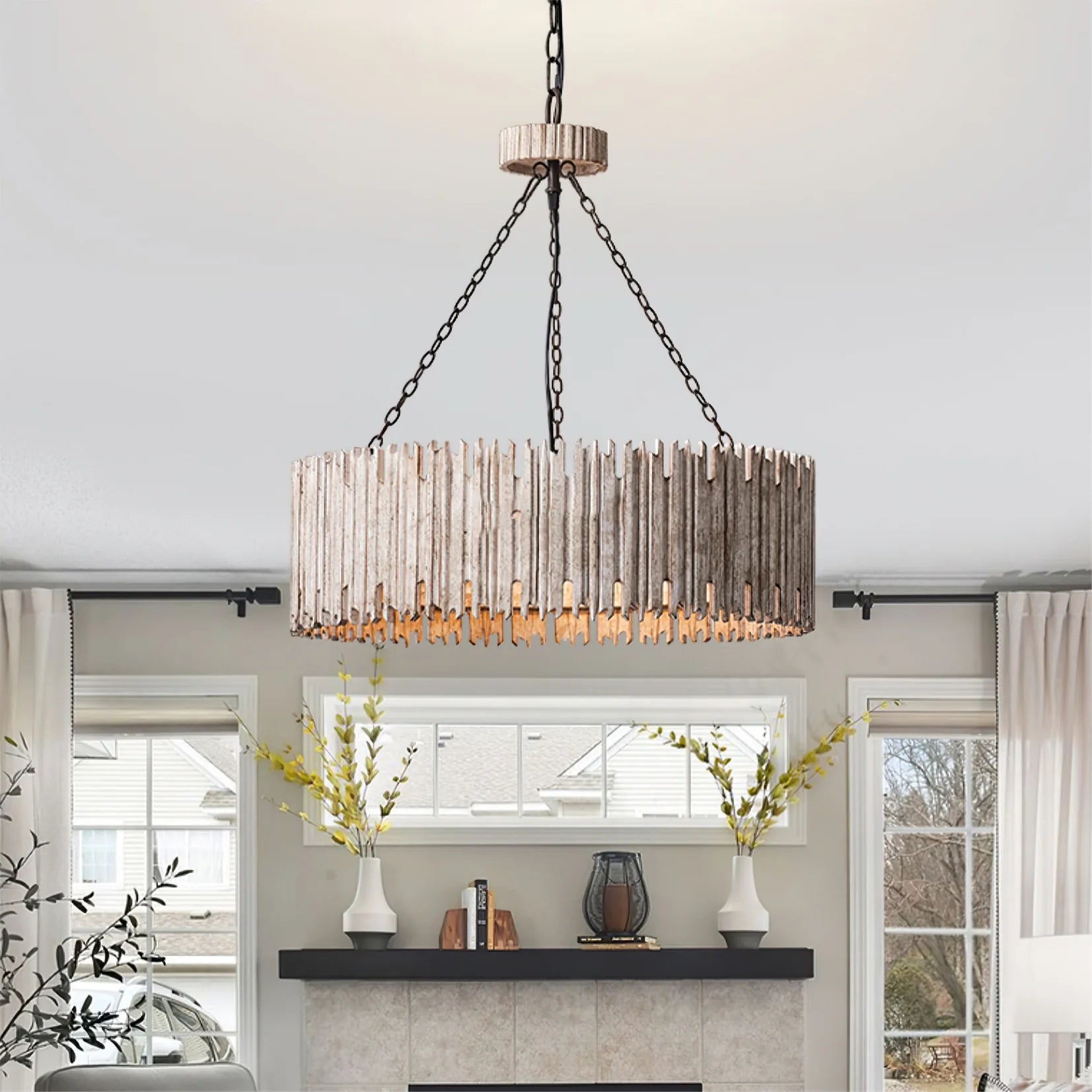 The Statement Drum Chandelier from Katianlight is an impressive blend of rustic and industrial design, with its circular wooden frame reminiscent of weathered timber planks. The chandelier's drum-shaped design creates an elegant, modern aesthetic while maintaining a raw, natural charm. The exposed metal chains and wooden slats add texture and dimension, perfect for homes that want to highlight organic and industrial elements.