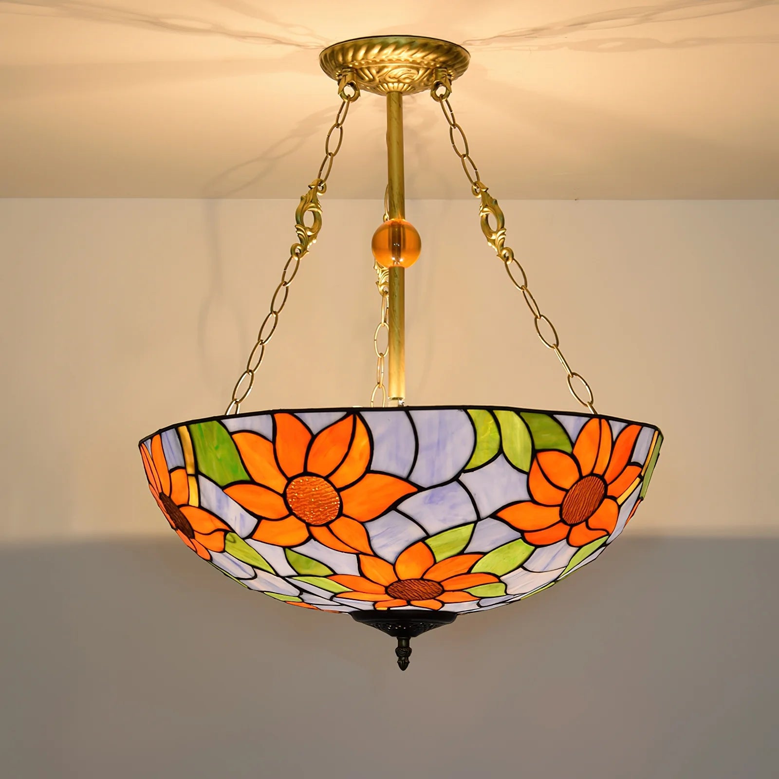 Evoking the golden warmth of a sun-dappled garden, the Sunnylace Chandelier is a radiant celebration of nature’s brilliance. Handcrafted with intricate stained glass, its bowl-shaped shade blossoms with vibrant florals—bold reds, soft pinks, tranquil blues—woven among winding golden branches and lush green leaves.