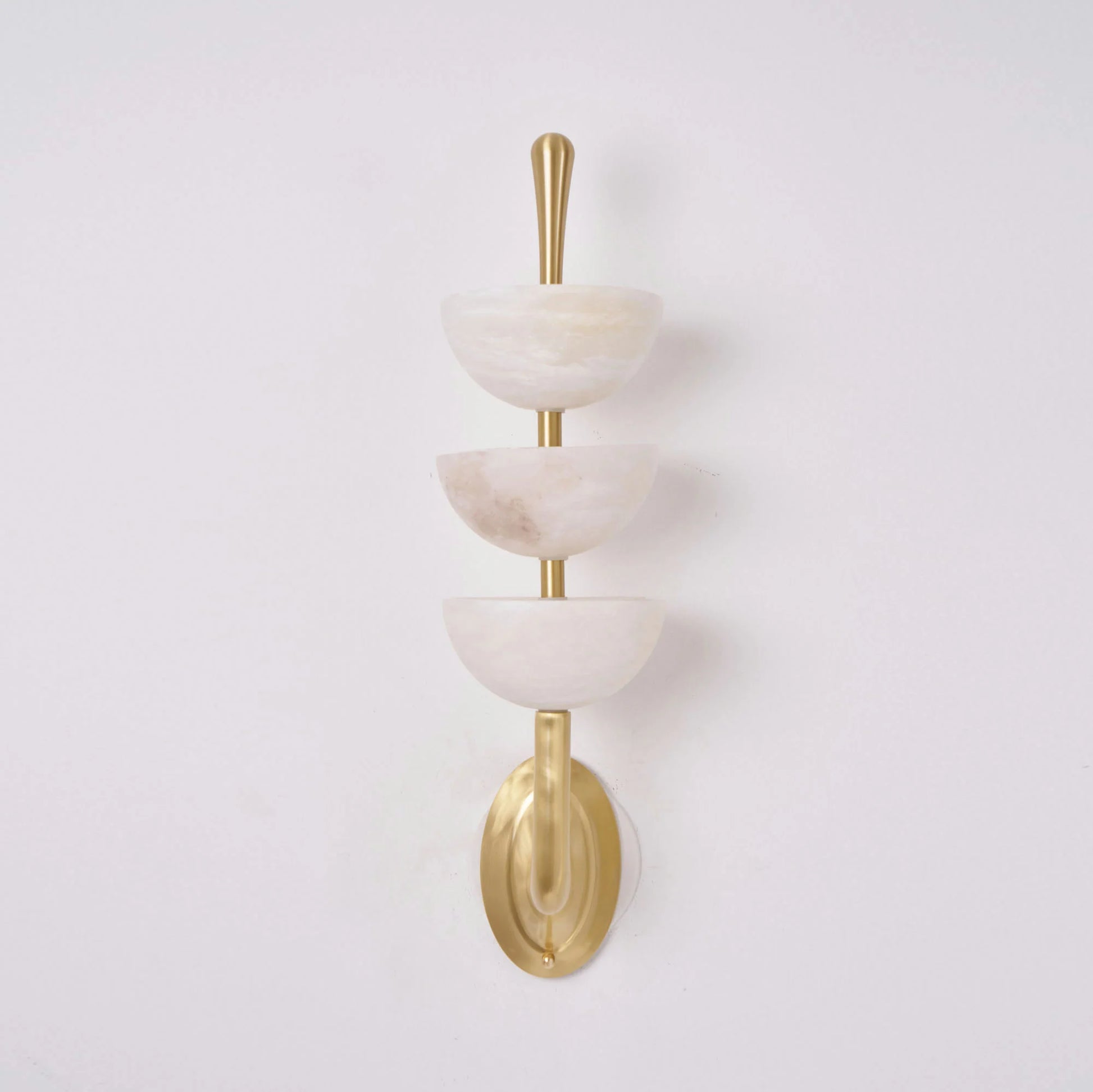 The Triple Alabaster Wall Sconce exudes elegance with its blend of snowflake stone and metal. Featuring three beautifully crafted alabaster shades, this sconce emits a soft, diffused light that creates a serene ambiance. The brass metal frame complements the natural patterns of the alabaster, making it a stylish and sophisticated addition to any room. Inspired by the timeless beauty of alabaster and the warmth of brass, this sconce is perfect for enhancing hallways, living rooms, or bedrooms with a touch of luxury and tranquility.