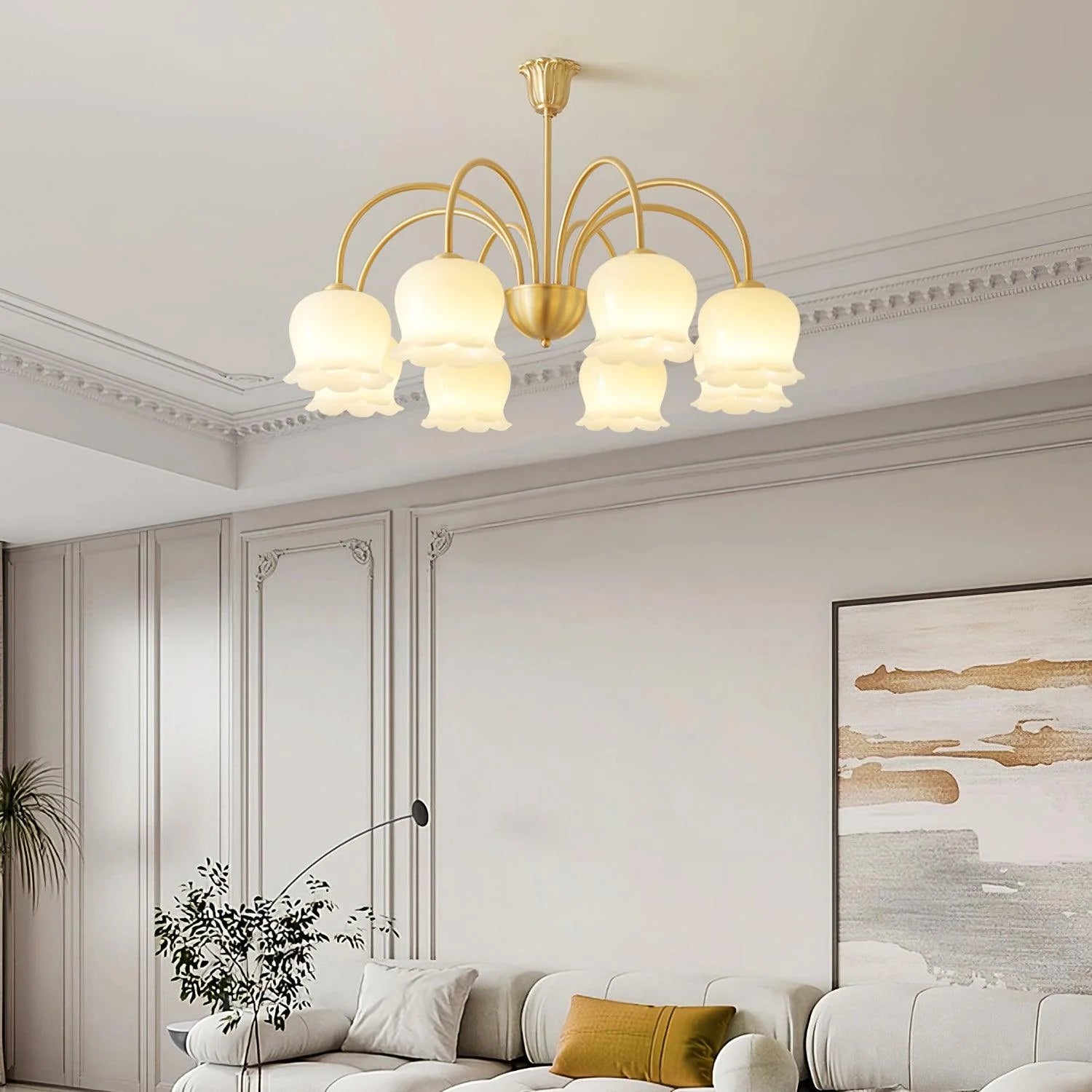 The Vintage Mia Chandelier is a timeless piece for any space, crafted in solid Gold and adorned delicate Beige Bell orchid. Its elegant silhouette casts a warm and inviting glow, perfect for imbuing a room with luxury and warmth.