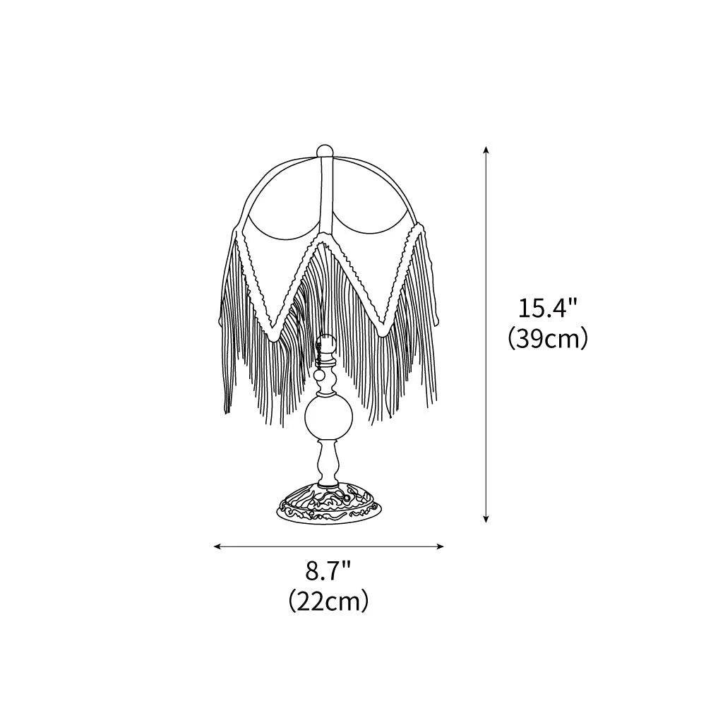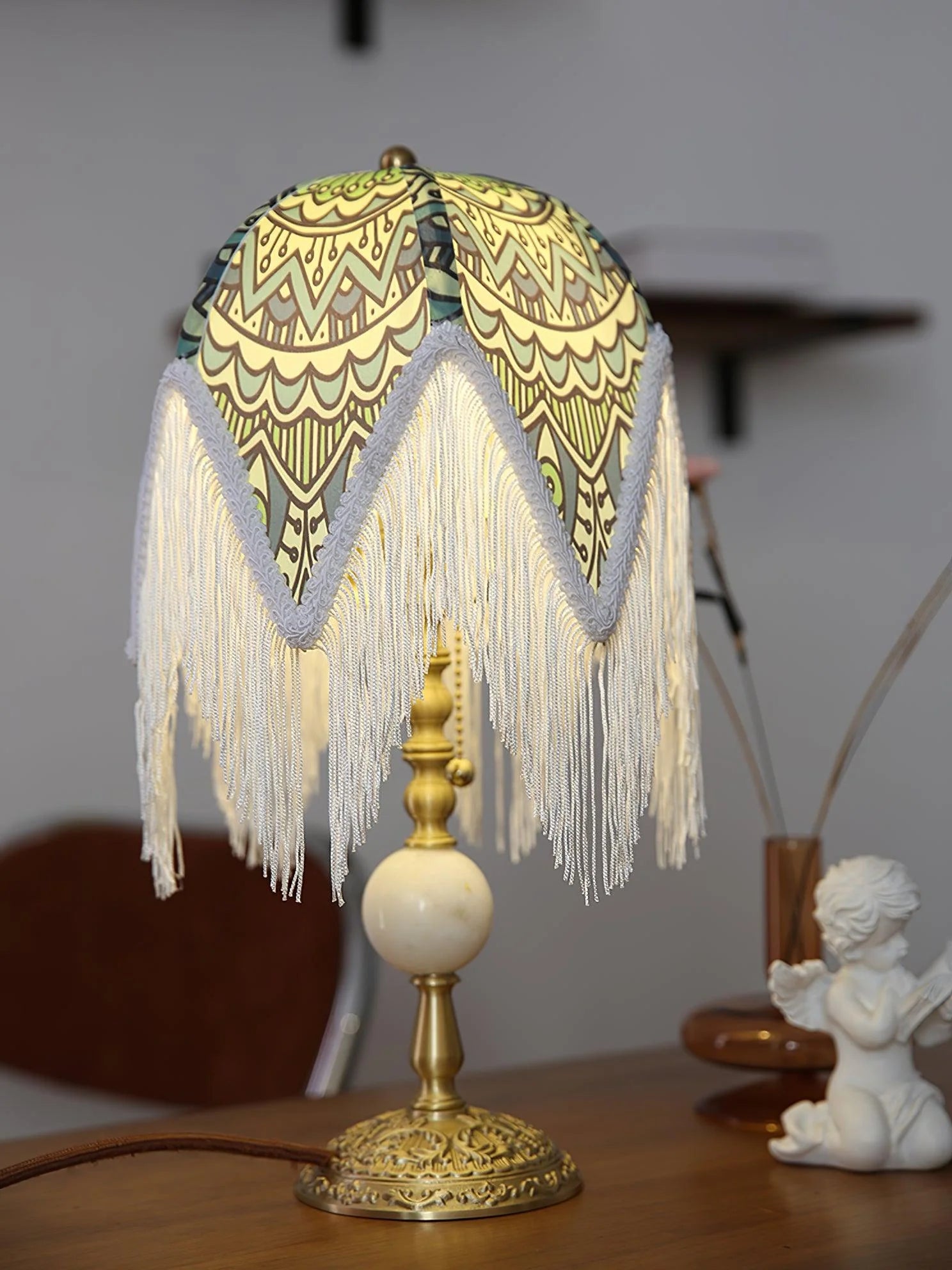 This With Fringes Vintage Flowered Table Lamp is sure to add a touch of elegance to any living space. It features a handmade cone-shaped lampshade with wavy edges that is made of green patterned fabric. The leg is made of sparkling marble and bronze with a carved floral decor. The convenient switch is located on the wire for ease of use.