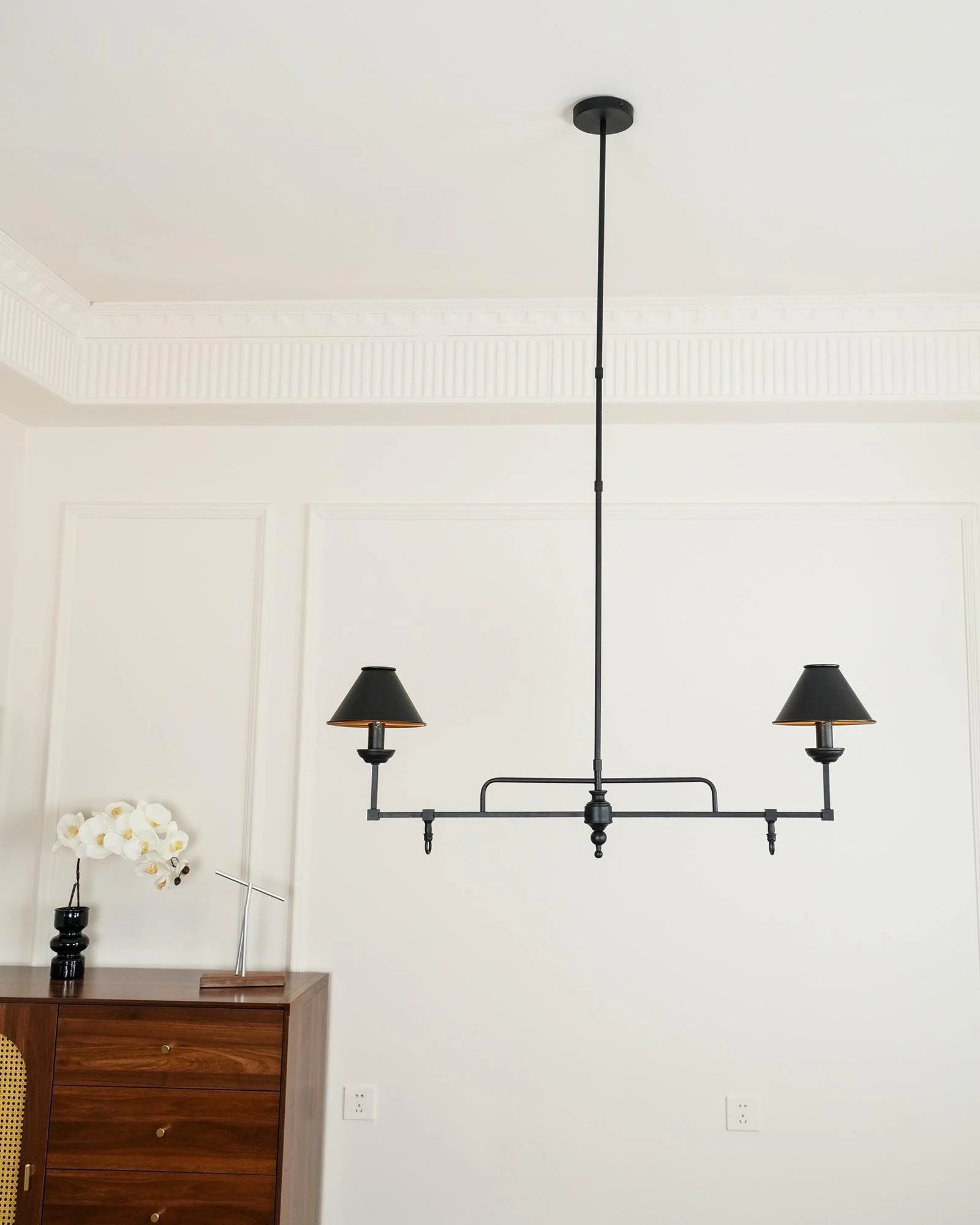 The Yanfu Linear Chandelier embodies the essence of sophistication with its striking contrast of colours and textures. Its design features a linear, clean black frame that supports a double-conical lampshade, while the gold interior adds a touch of elegance. The chandelier's structure is both simple and bold, and is designed to cast a warm and inviting glow over the kitchen island or dining table.